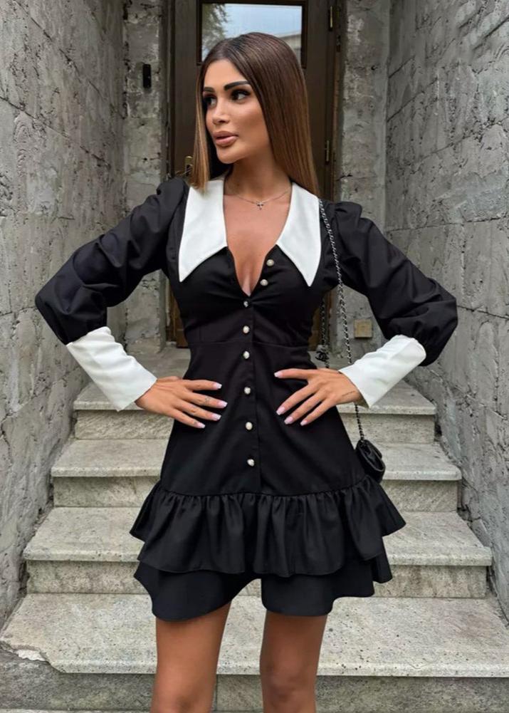 The Scarlet Elegance Dress combines timeless sophistication with a modern touch. Featuring a striking contrast collar and cuffs, this dress is tailored for a flattering fit with a cinched waist and a ruffled hem for added femininity. The lace-up back adds an adjustable fit, while pearl-inspired buttons complete its chic aesthetic. Perfect for romantic evenings, holiday parties, or making an impression at any special event.