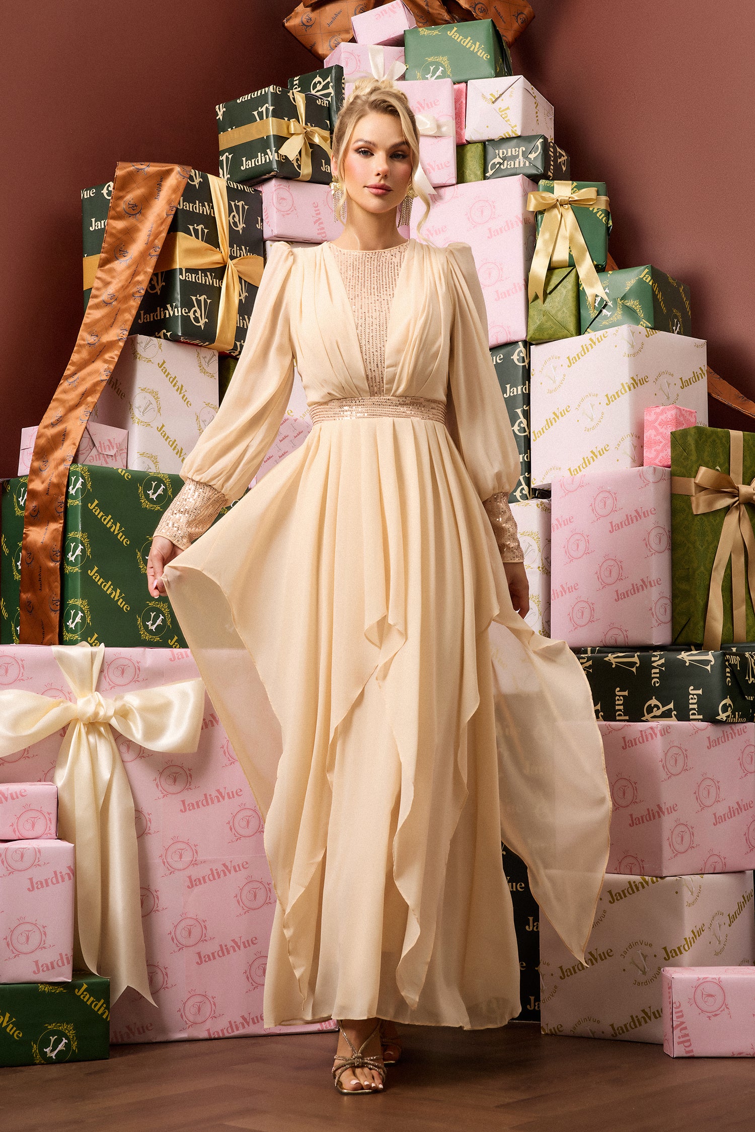 - Solid color, beige, long sleeve, round neck, sequin, maxi dress