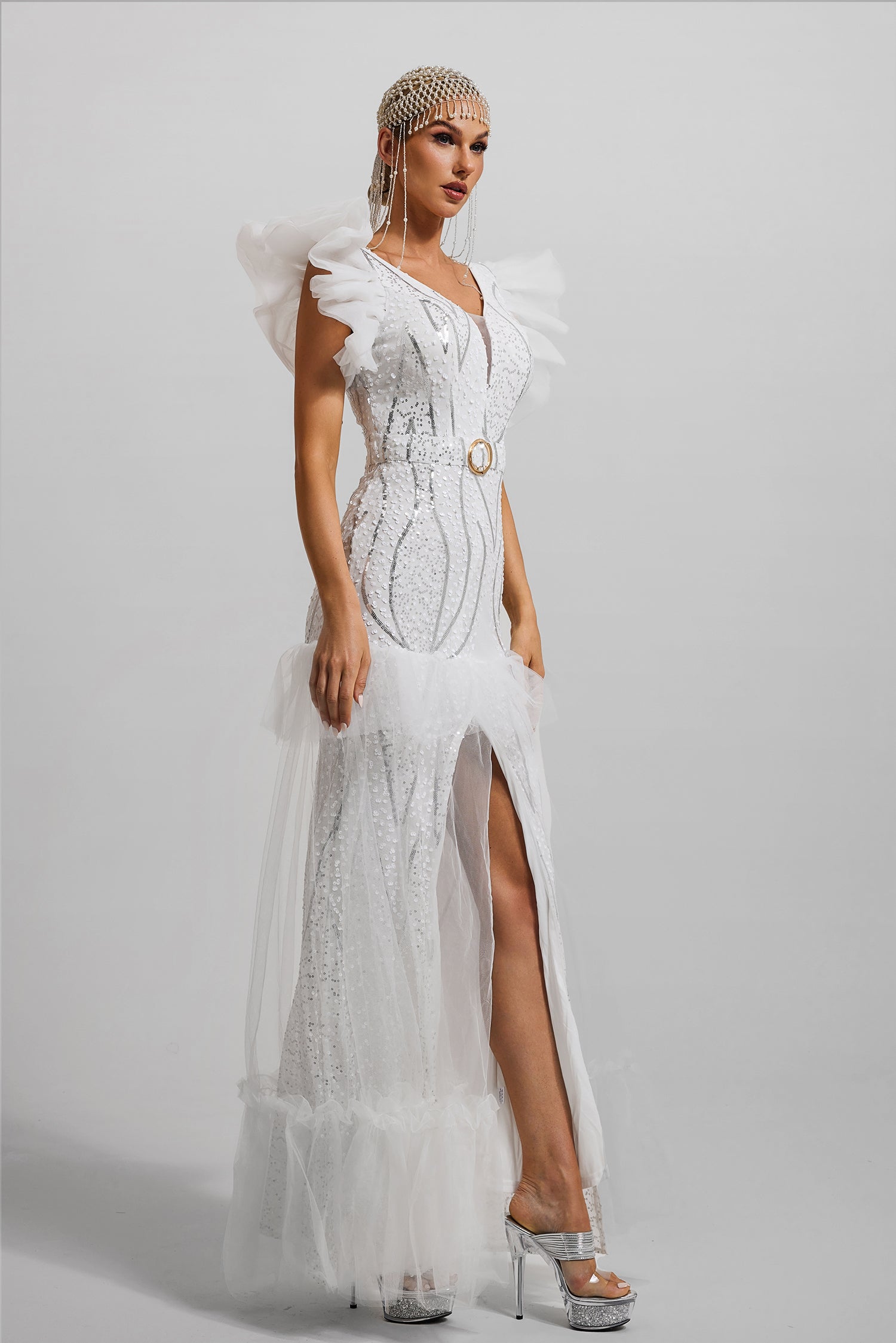 - Ruffle, v-neck, sleeveless, white, maxi dress