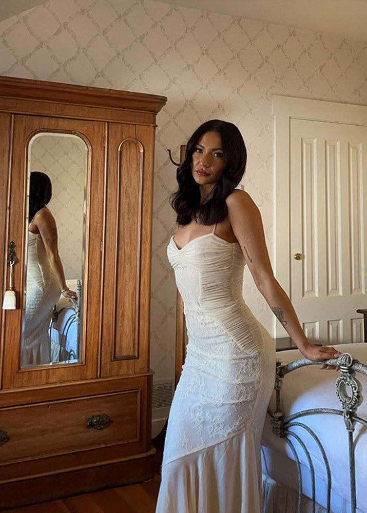 Seraphina - Lace Mermaid Evening Gown exudes timeless sophistication with its delicate lace bodice and flowing mermaid silhouette. The fitted bustier top with ruched detailing enhances your natural curves, while the intricate lace overlay adds an ethereal touch. Adjustable spaghetti straps provide a customized fit, and the asymmetrical hemline cascades elegantly, creating a graceful, flowing movement. Perfect for formal events, weddings, or gala nights, this gown is designed to make a lasting impression.