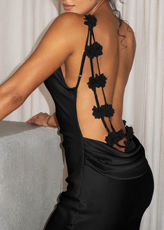 Seraphina is a refined satin evening gown designed for effortless elegance. The draped cowl neckline and slim spaghetti straps create a delicate, feminine touch, while the open-back design with floral appliqué detailing adds a striking, romantic allure. Crafted from silky satin, this floor-length dress gracefully skims the body, ensuring a flattering fit. Perfect for weddings, formal events, and upscale soirées, this gown brings timeless sophistication to any occasion.
