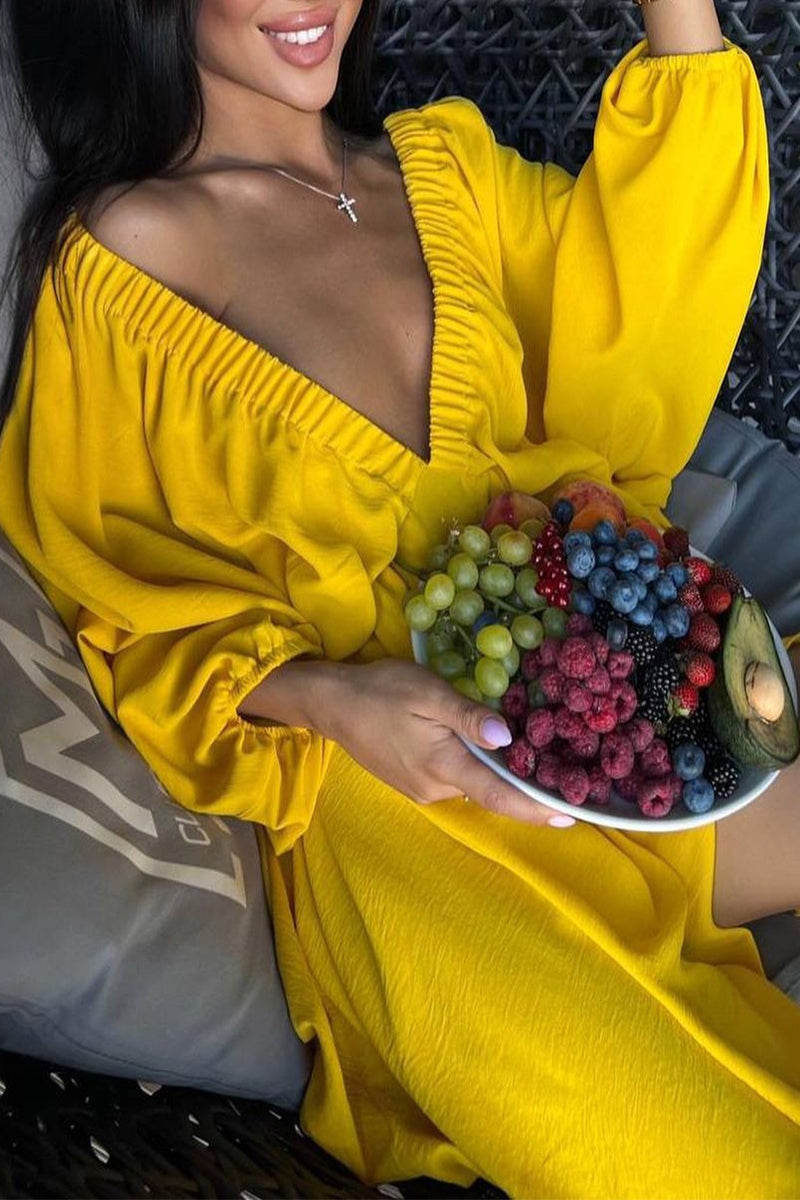 Sexy Simplicity Solid Flounce Fold V Neck Long Sleeve Dresses