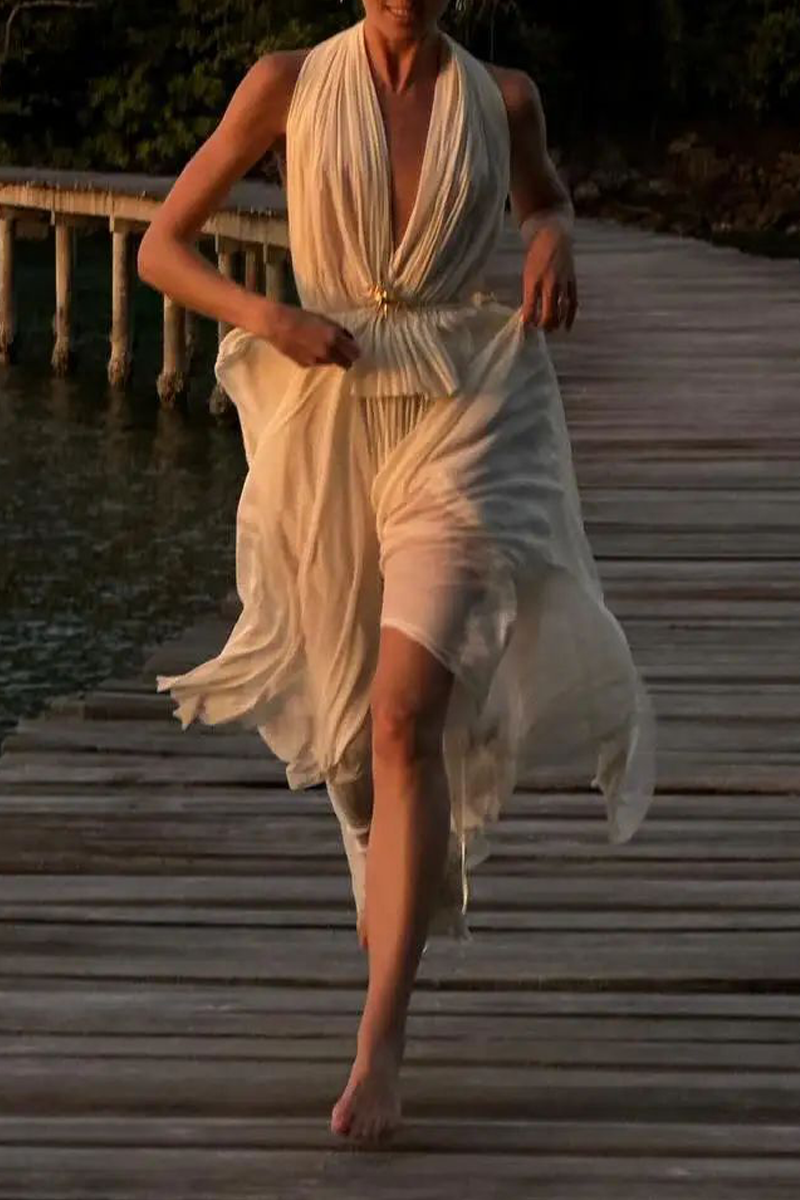 Sexy Backless Ruched Irregular Halter Sleeveless Two Pieces
