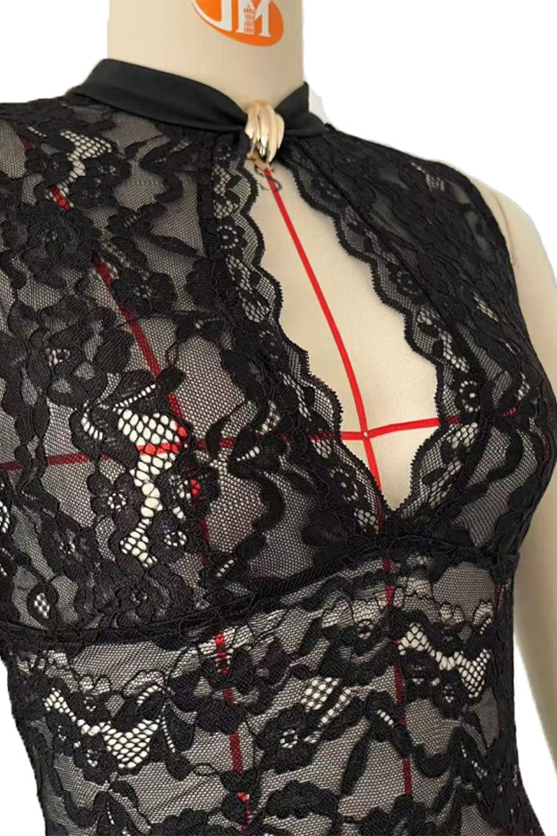 Sexy Lace Hollow Out Slit O Neck One Step Skirt Dresses