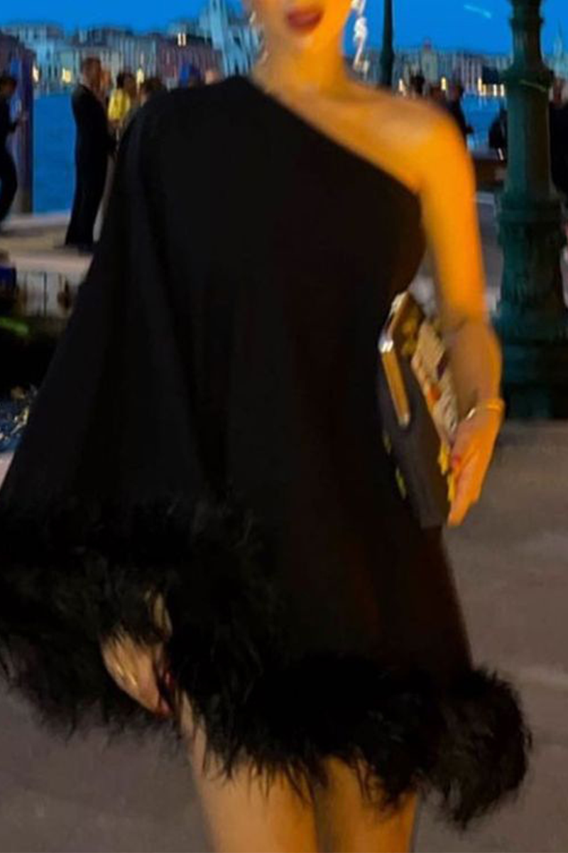 Sexy Solid Feathers Oblique Collar Asymmetrical Dresses