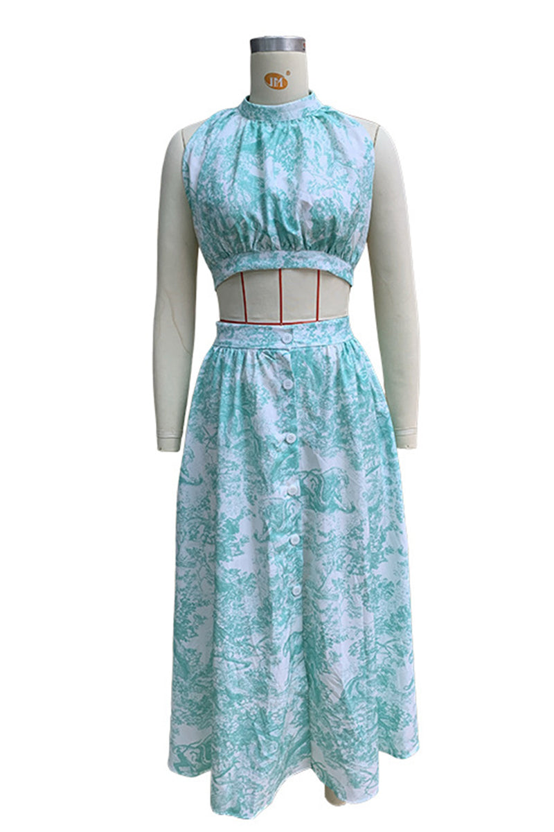 Sexy Street Floral Print Pocket Lace Up Buckle Backless Halter Sleeveless Two Pieces