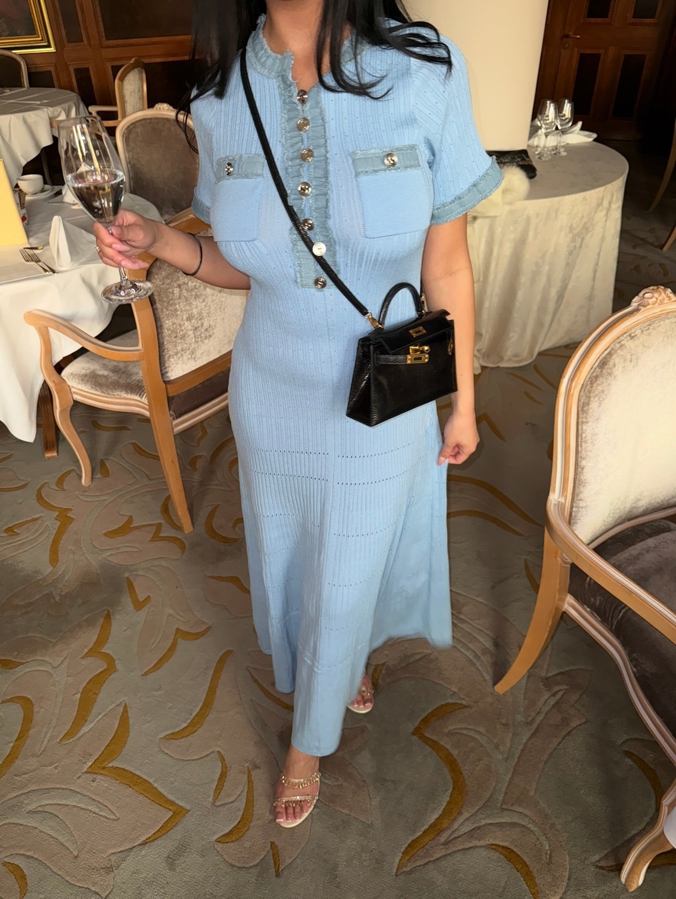 Maxi-Kleid aus extravagantem Strick mit Einsätzen aus ausgefranstem Denim mit geknöpftem Rundhalsausschnitt, kurzen Ärmeln und zwei aufgesetzten Brusttaschen.