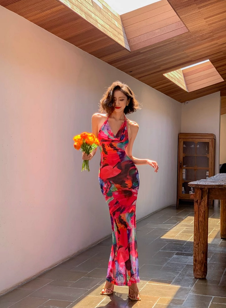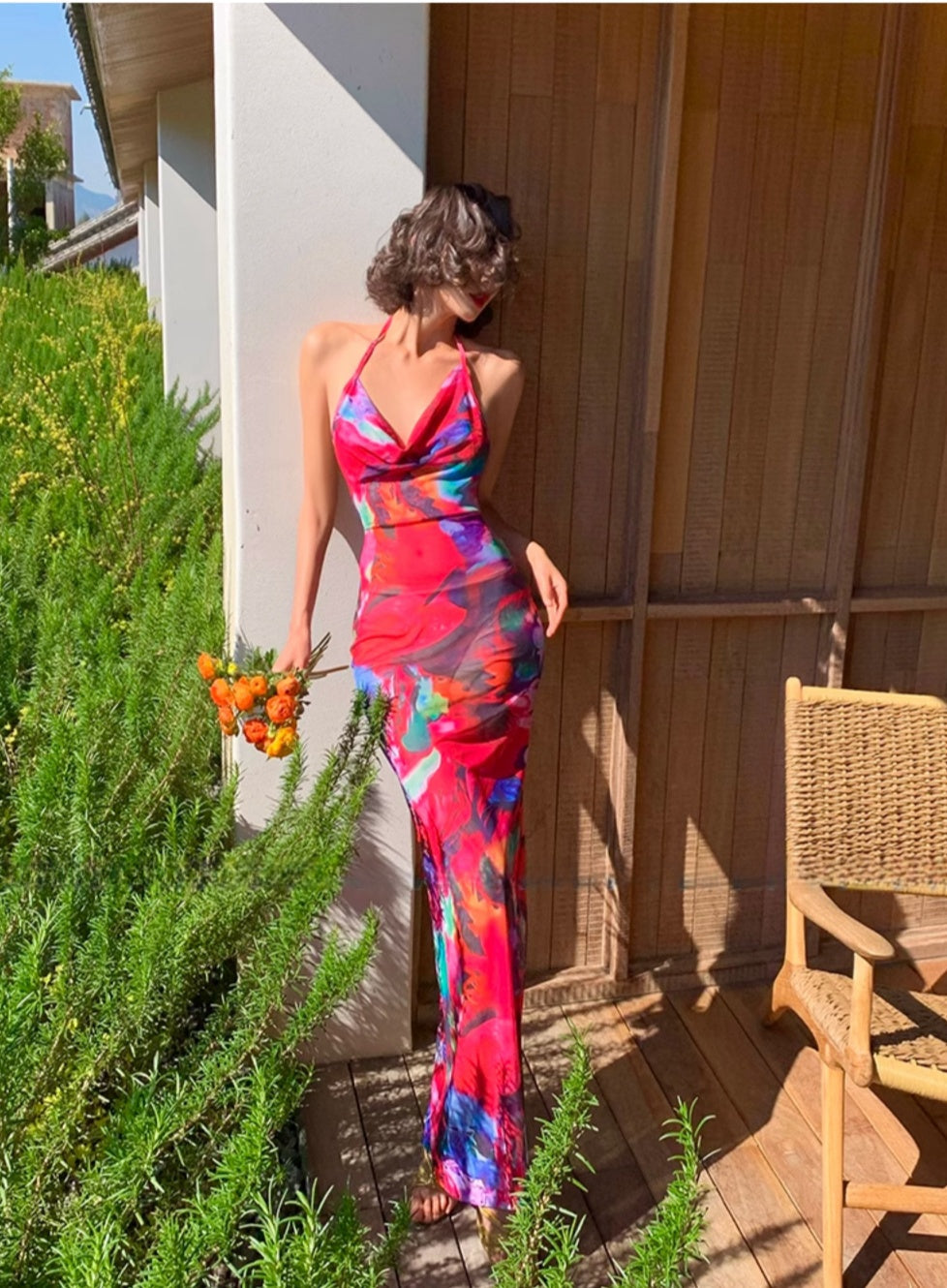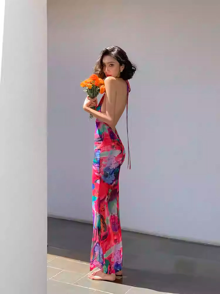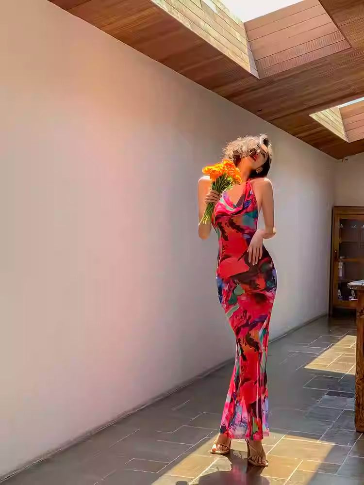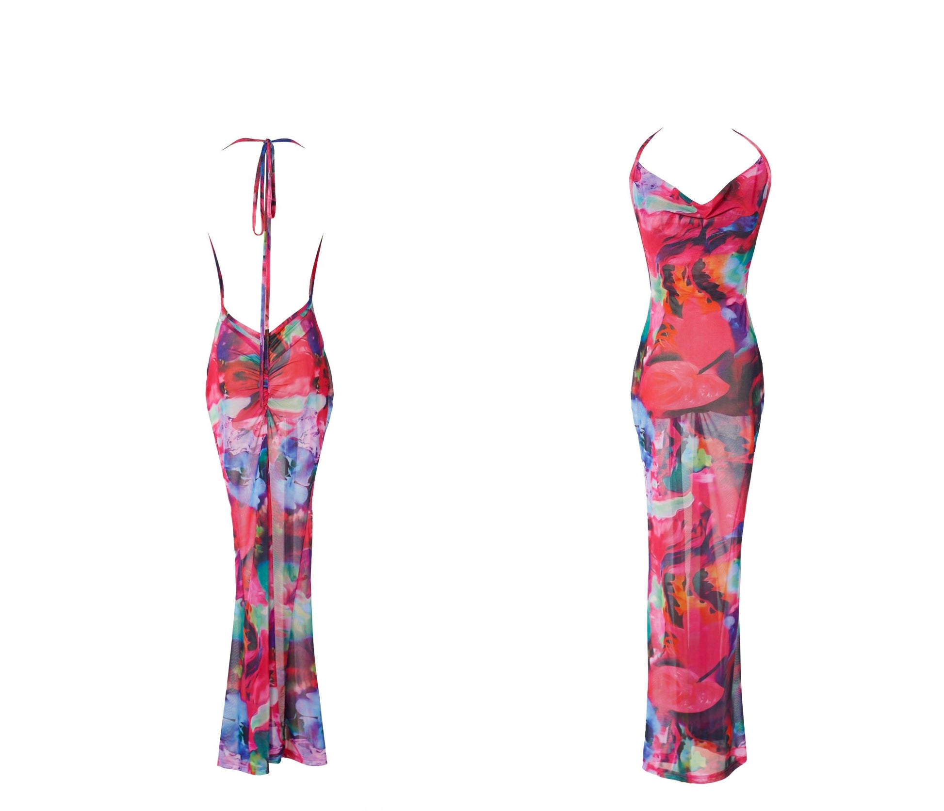 - Sheer Floral Resort Cover-Up Dress - Sexy Backless Vacation Maxi Gown