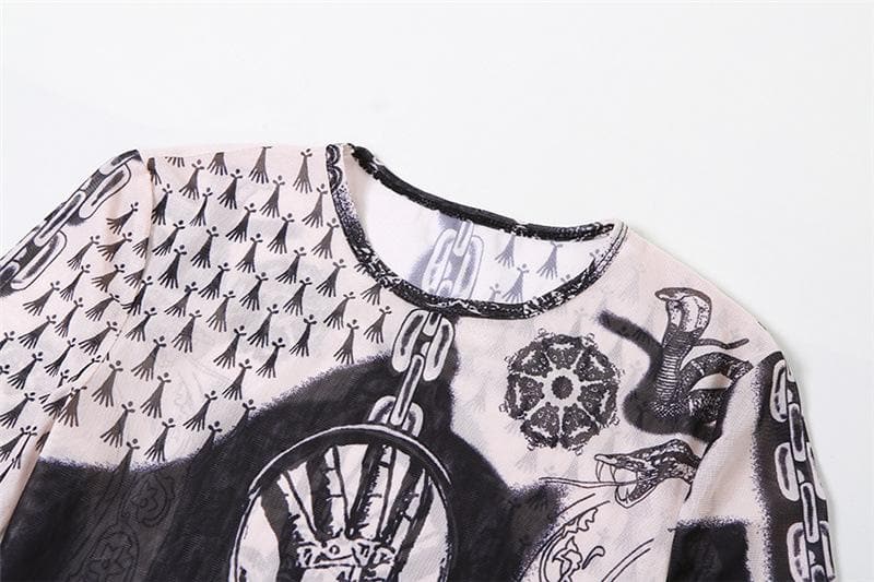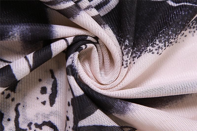 Sheer mesh abstract contrast see through long sleeve maxi dress