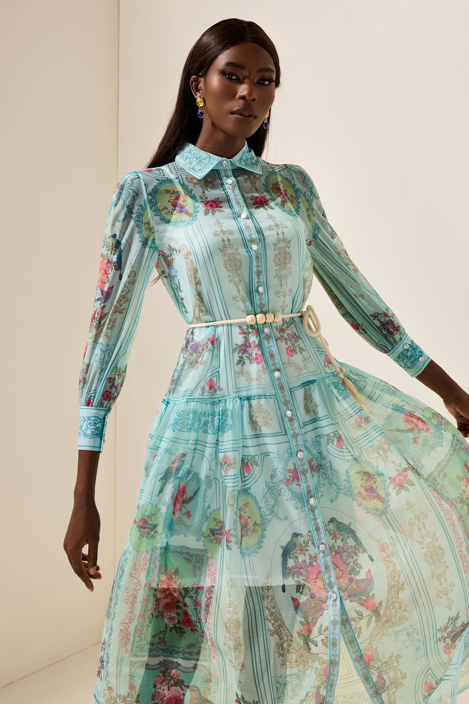 - Long sleeve, lantern sleeve, light green, shirt collar, floral print, midi dress