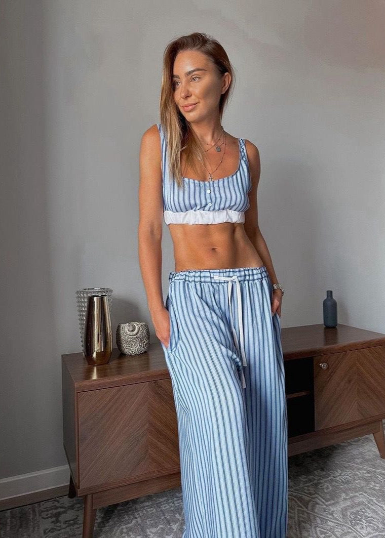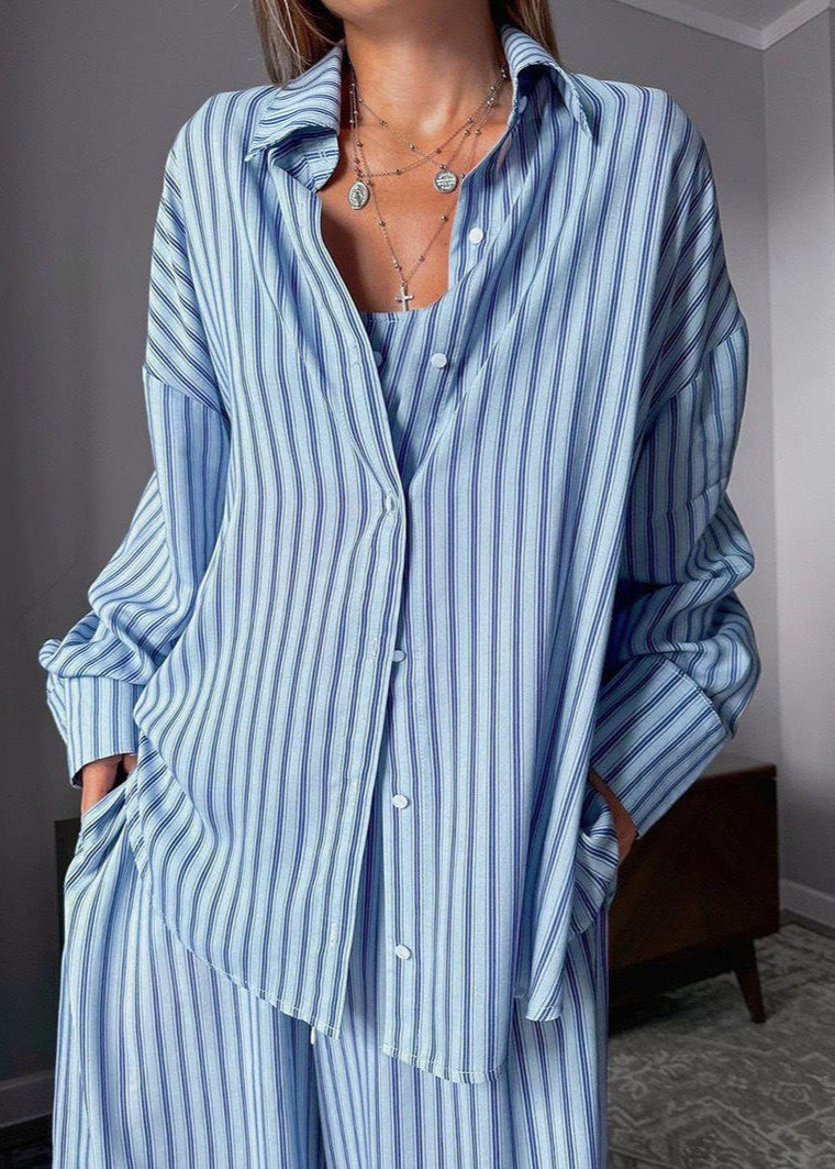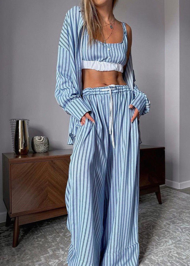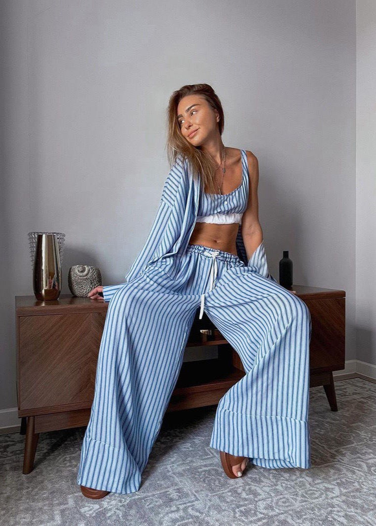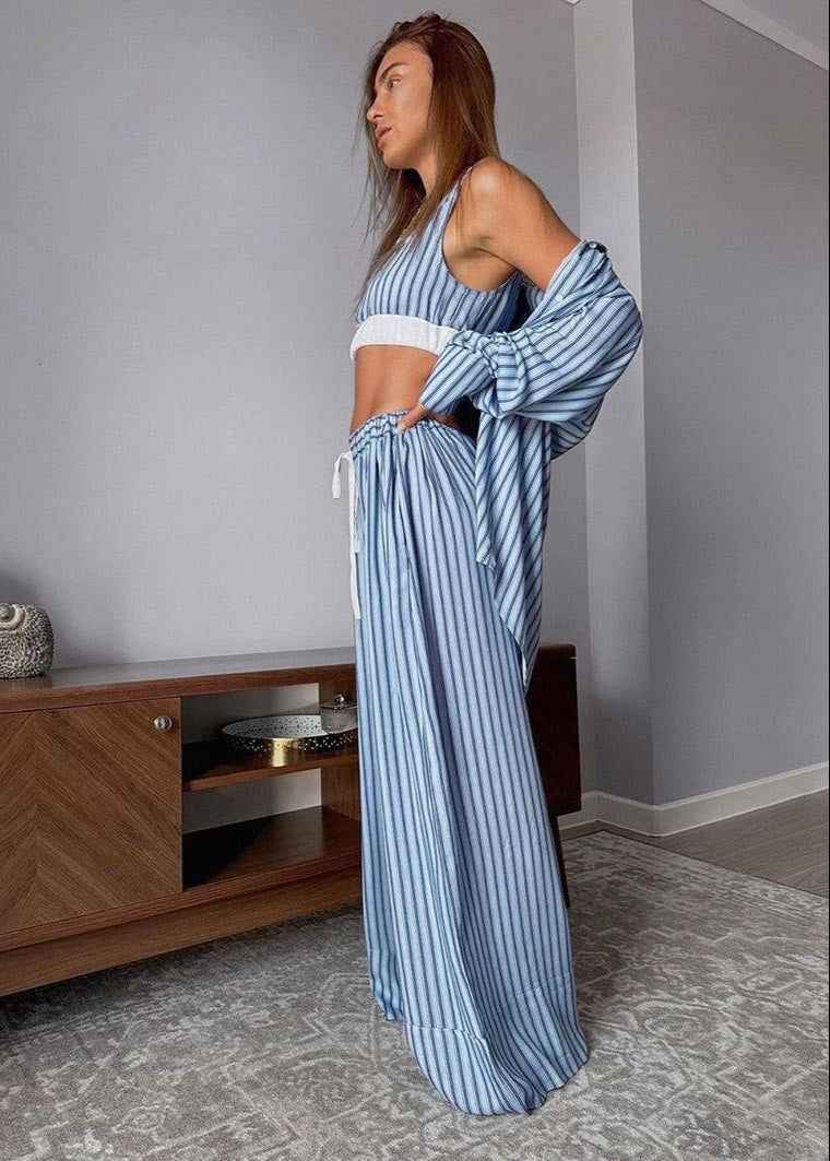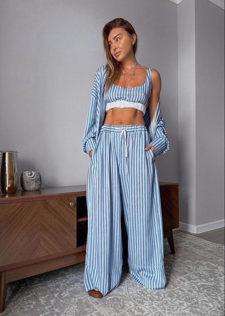 Skyline Stripe 3-Piece Lounge Set – Oversized Shirt, Crop Top & Wide-Leg Pants