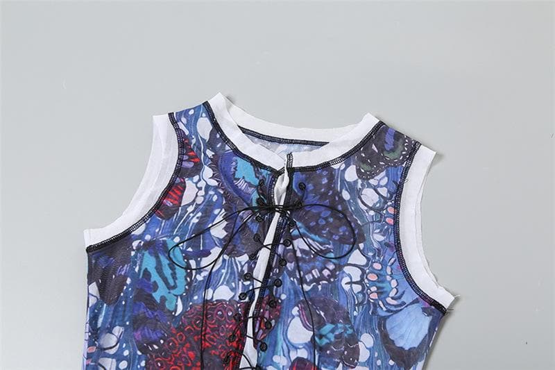 Sleeveless crewneck lace up print sheer mesh maxi dress