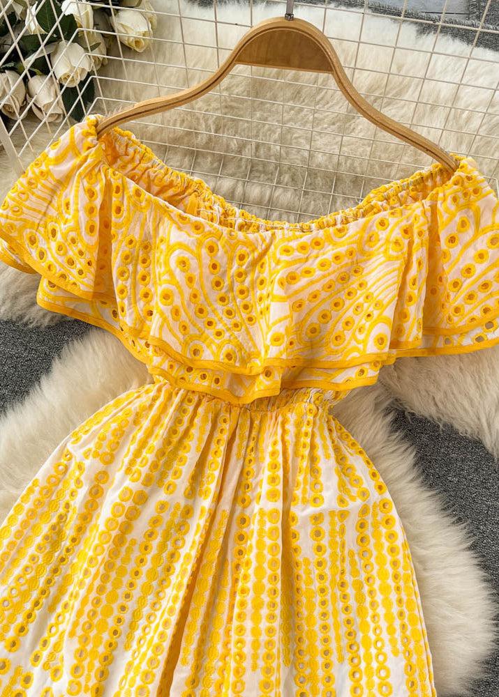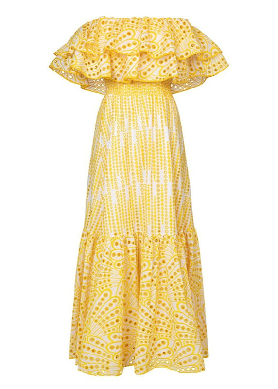 The Soleia Ruffle Off-Shoulder Dress brings sunshine to your wardrobe with its vibrant Yellow embroidery and romantic silhouette. Designed with a flattering off-the-shoulder neckline, voluminous ruffle overlay, and a smocked waist that enhances your shape, this breezy midi dress is perfect for summer getaways, garden parties, or sunny day strolls. The eyelet detailing and tieRed skirt add texture and movement, while the lightweight fabric keeps you cool and comfortable.