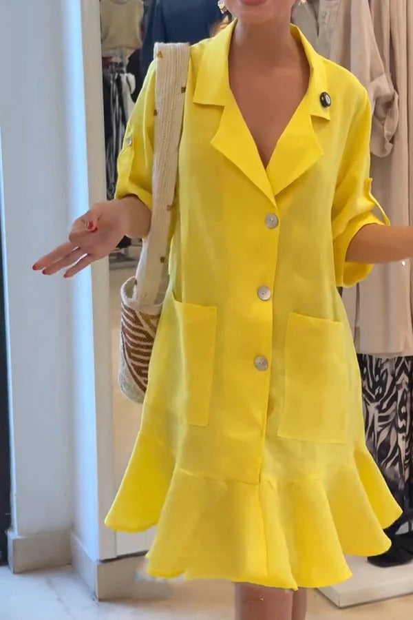 Solid Color Casual Lapel Pocket Ruffle Loose Mini Dress