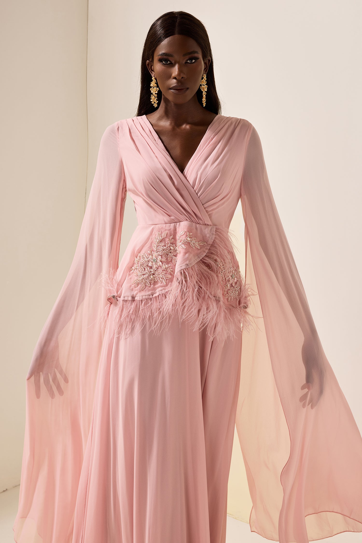 - Long sleeve, solid color, pink, feather, embroidered, maxi dress