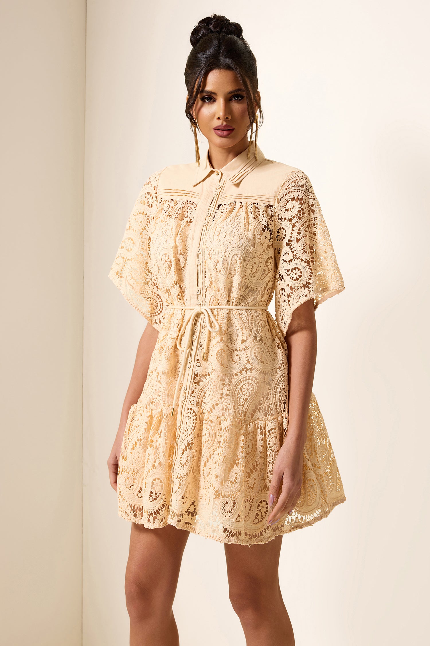- Short sleeve, light yellow, solid color, shirt collar, mini dress