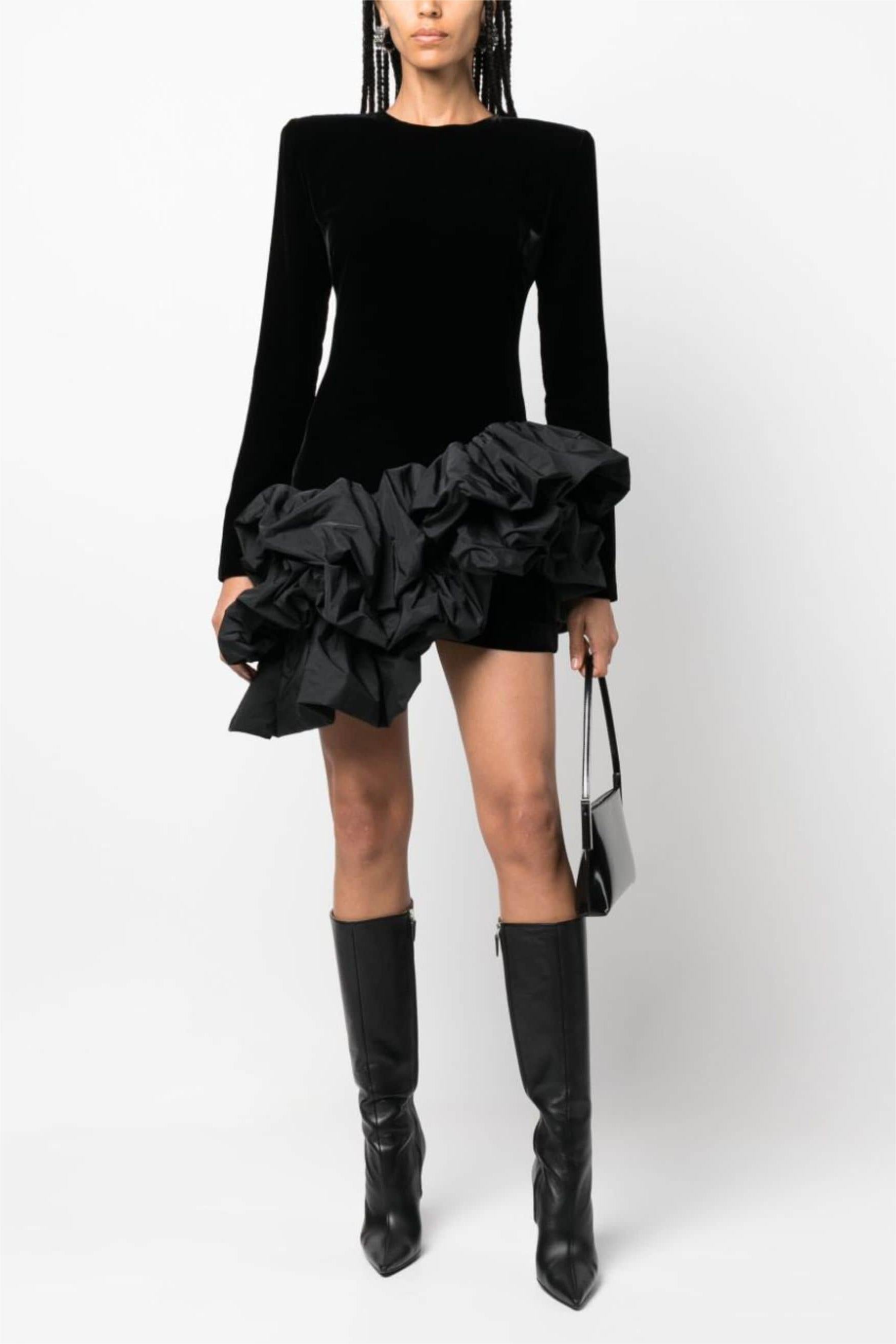 - Solid color, black, velvet, long sleeve, ruffle, mini dress