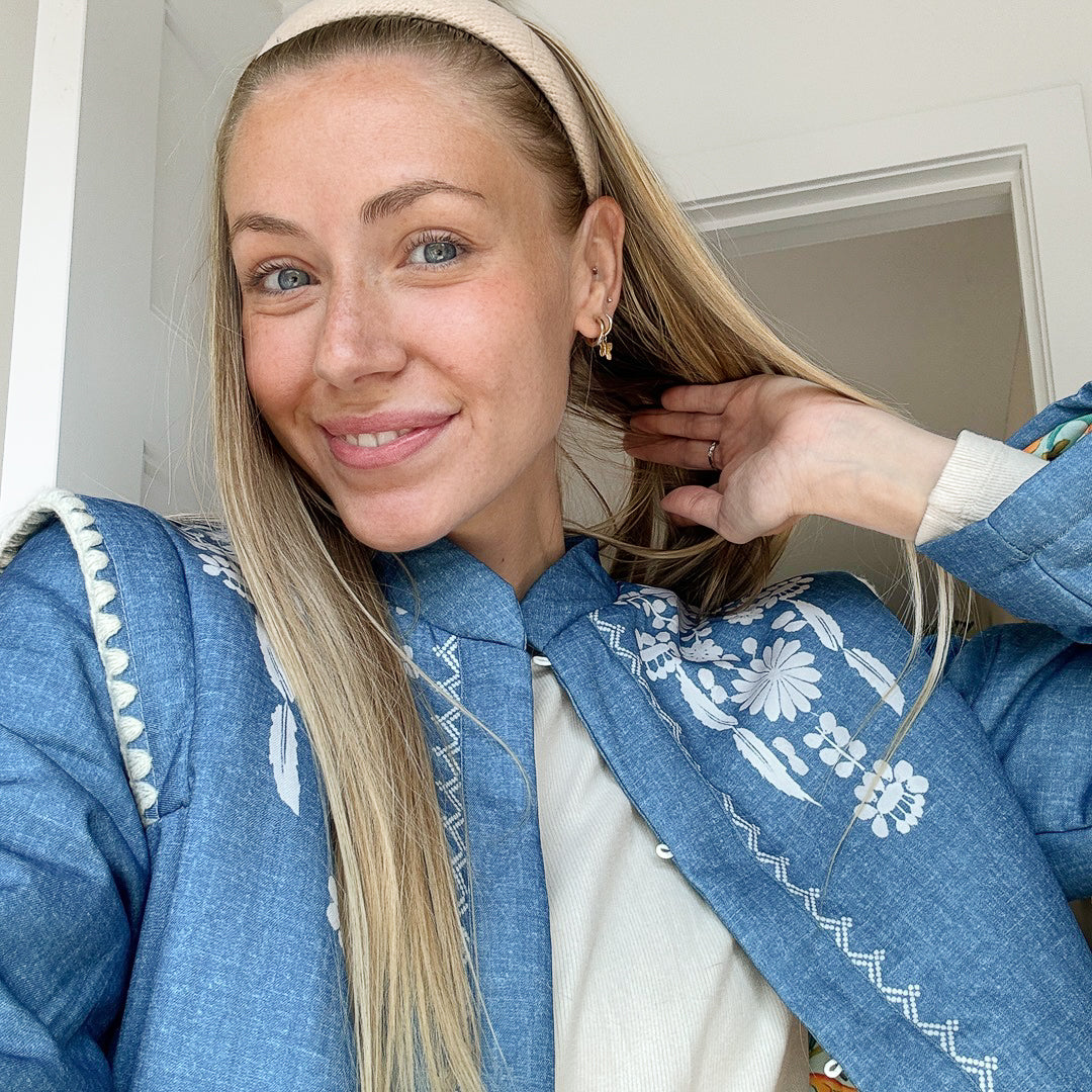 This floral print jacket features delicate small white embroidery on the shoulders, adding a subtle yet sophisticated accent. Its practical design includes two spacious pockets, ideal for keeping your essentials close at hand. Plus, the unique button loops closure offers a modern twist, making it both functional and stylish.