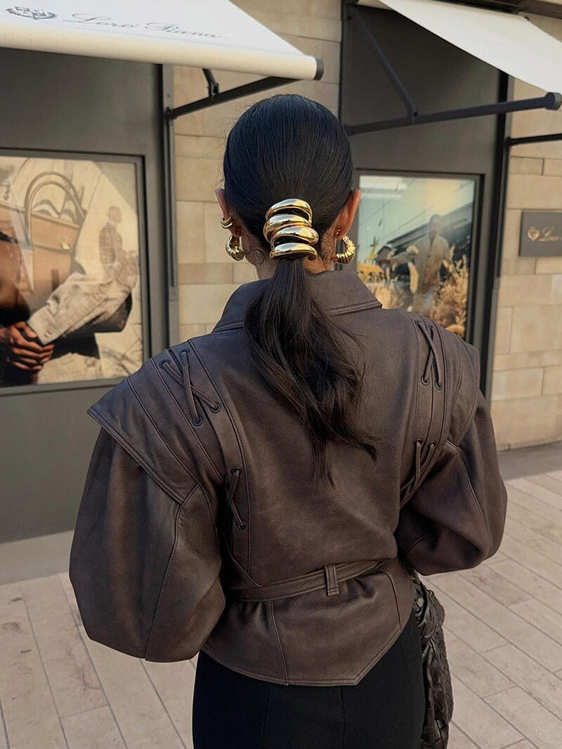 This statement faux leather kimono jacket features a bold, structured design with a belted waist. Perfect for making a dramatic entrance, it offers a unique blend of style and edge for any occasion.