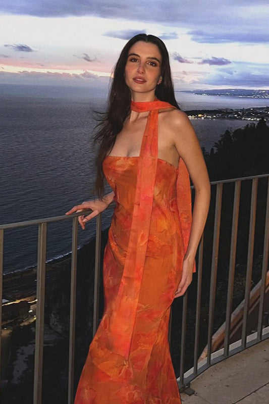 Strapless Tie-Detail Floral Mesh Maxi Dress