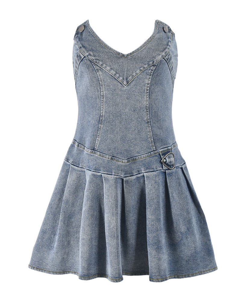 Stretch Denim Chest Wrap Sexy Pleated V-Neck Denim Dress