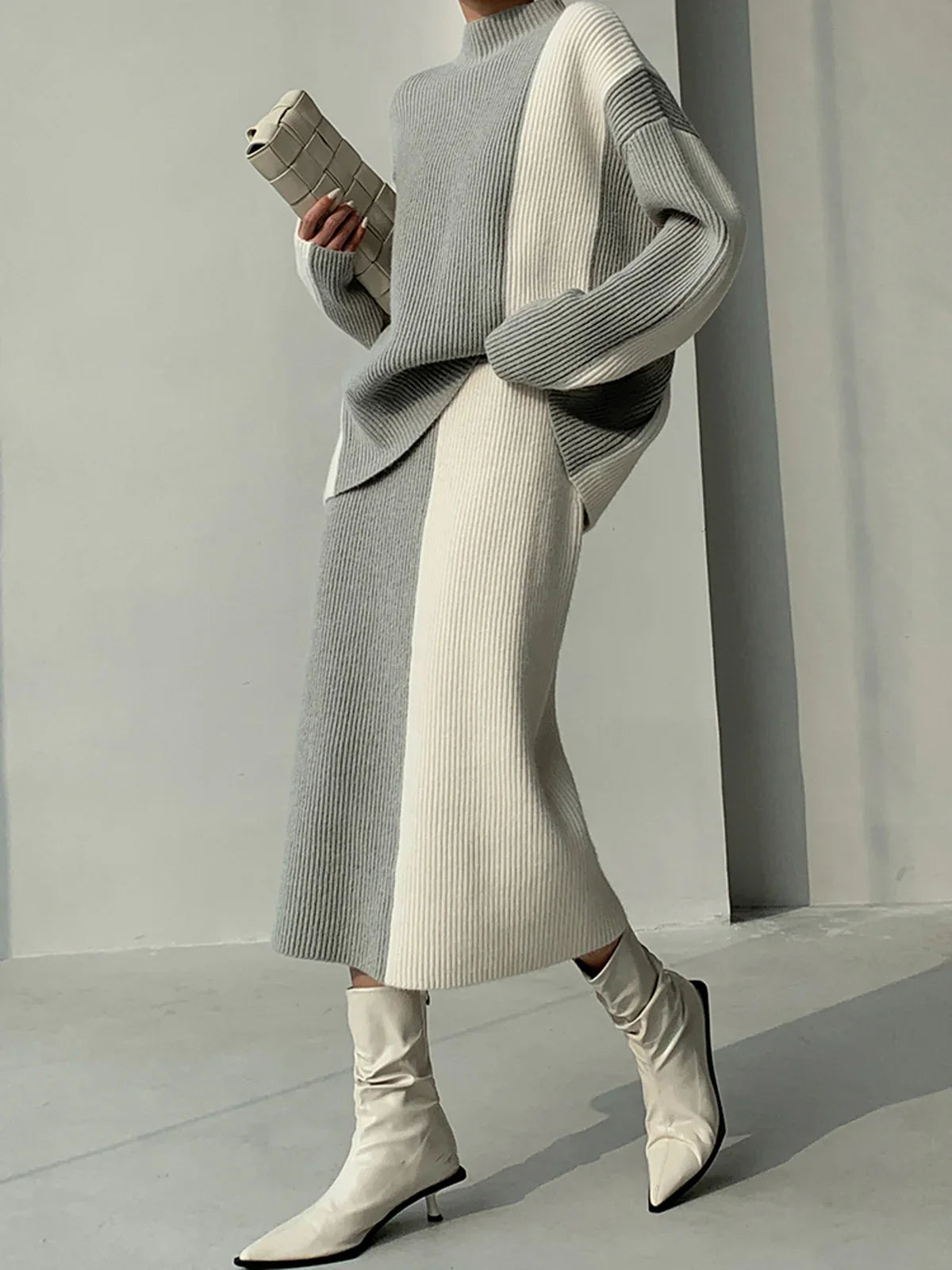 Design: A chic two-piece set featuring a striped knit top with a classic round neckline, paired with a coordinating high-waisted skirt. The timeless pattern and fitted silhouette create an effortlessly polished look.