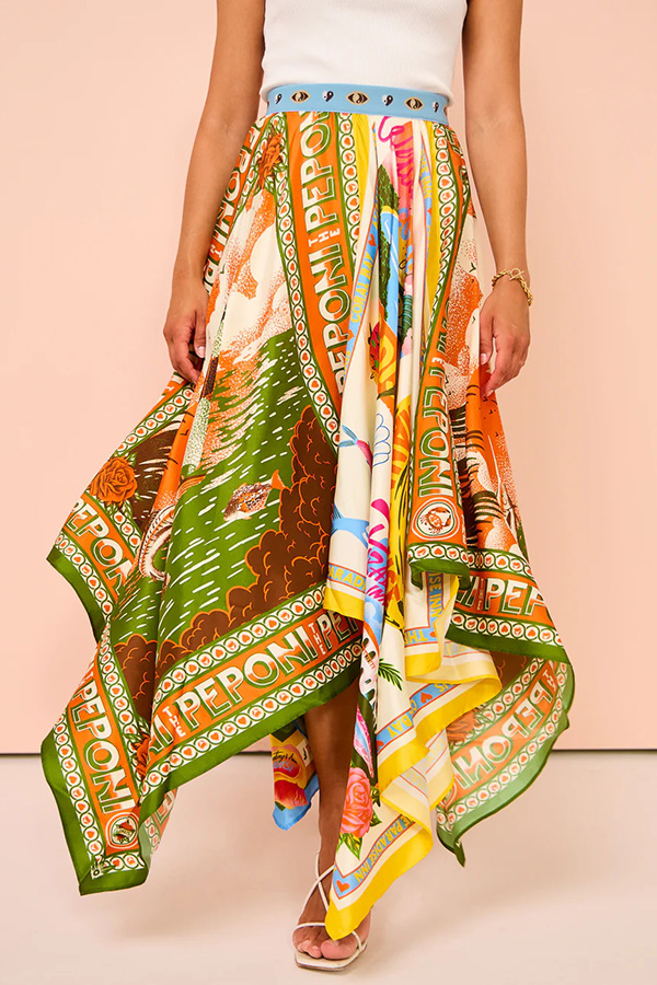 Made from silk-satin, this skirt has a pleated midi silhouette, uneven hem and elasticated waistband for comfort. Loved for its bright and bold prints, experience the weekend or summer getaway in style.
