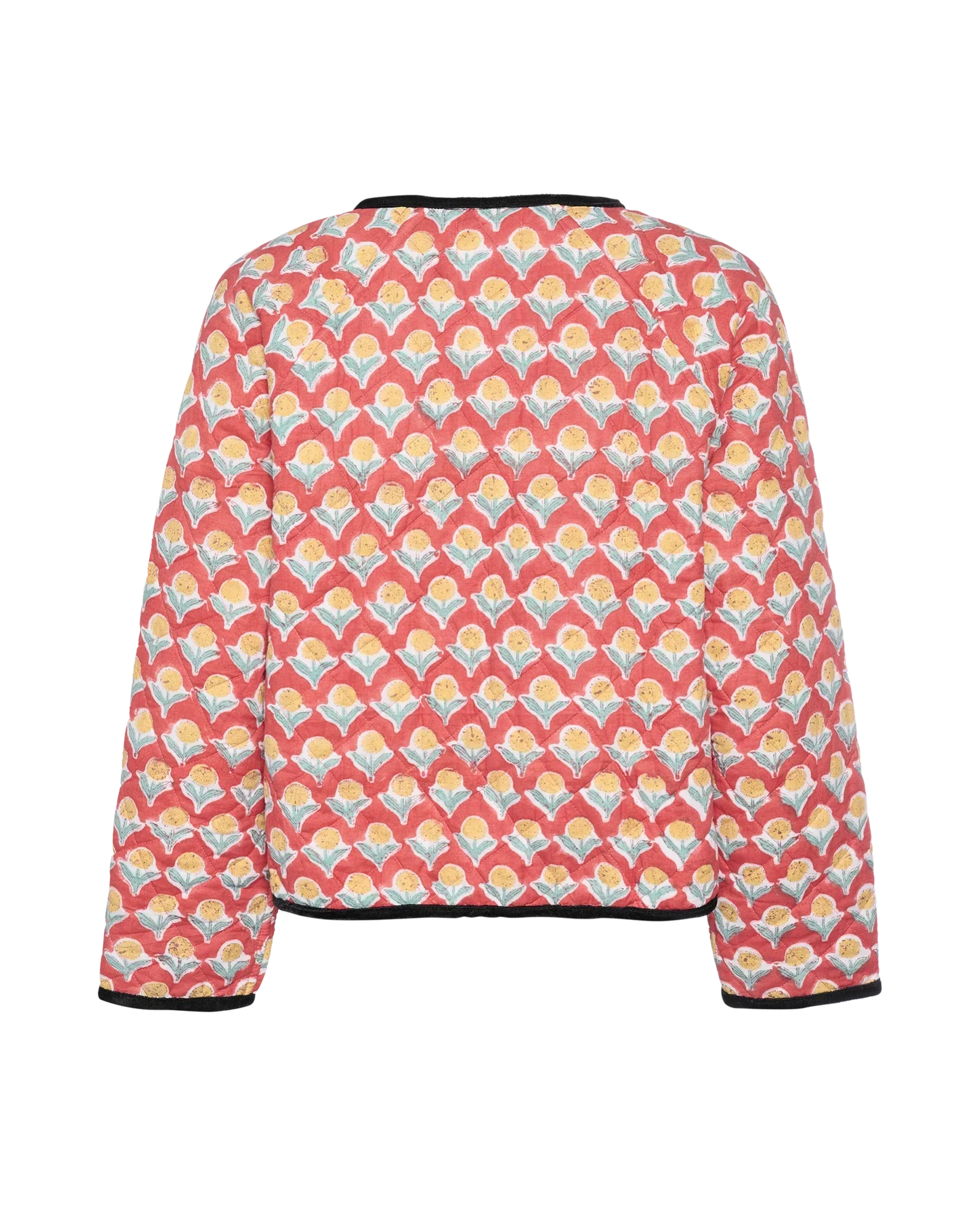 The Suvanna Jacket combines a casual silhouette with artisanal craftsmanship, crafted from 100% organic cotton and adorned with a unique all-over block print. The jacket features raglan sleeves for added comfort and a lightly padded design, perfect for layering. The front placket is open and can be secured with two sets of elegant jersey velvet bow ties. Inside, striped cotton tapes finish the look with a touch of detail.