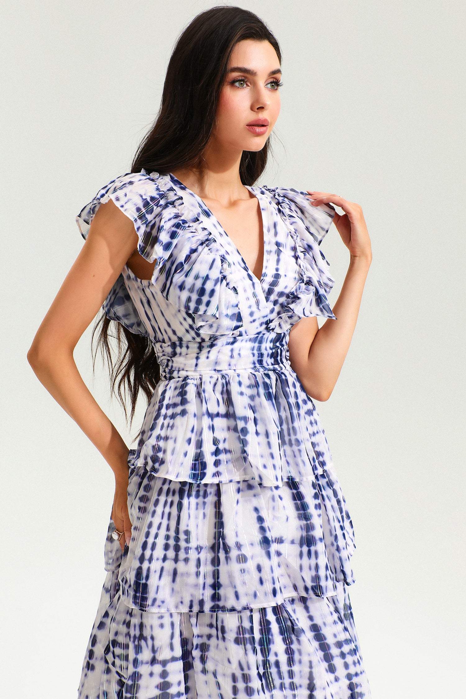 - V-neck, sleeveless, ruffle hem, abstrat print