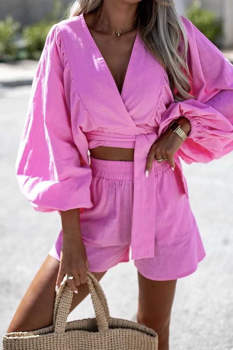 Sweet Solid Frenulum Fold V Neck Long Sleeve Two Pieces(3 Colors)