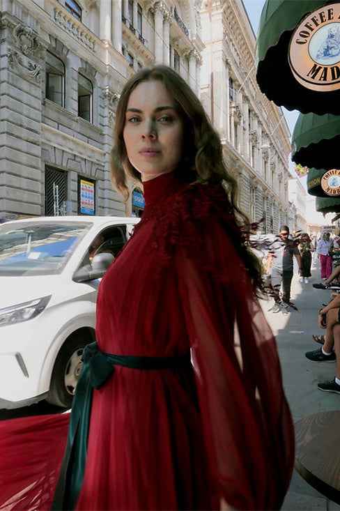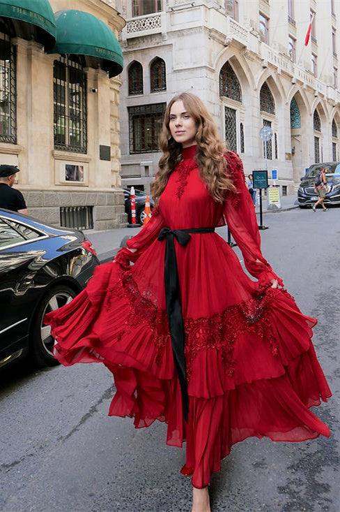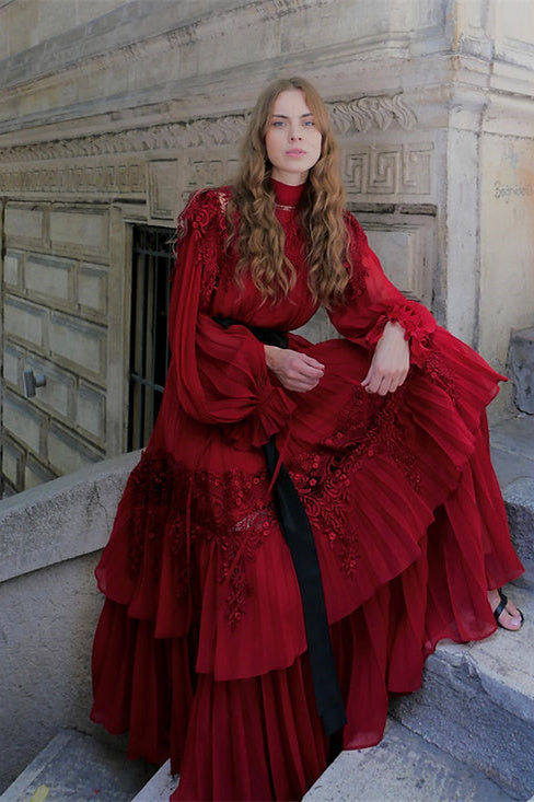 High Neck, Embroidered Lace, Tiered Hem, Long Sleeves, Ruffle, Pleated, Maxi Length.