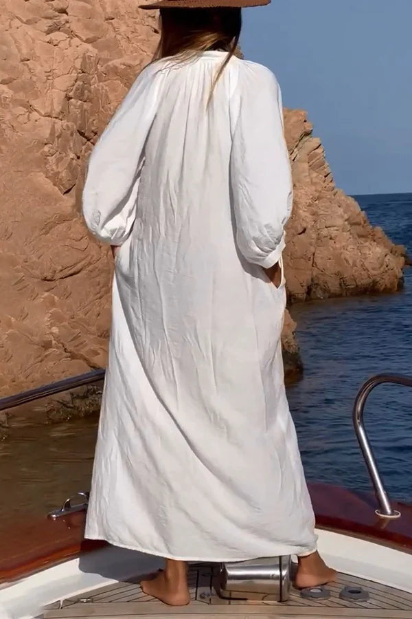 Take A Relax Balloon Sleeve Button Pocketed Loose Shirt Maxi Dress
