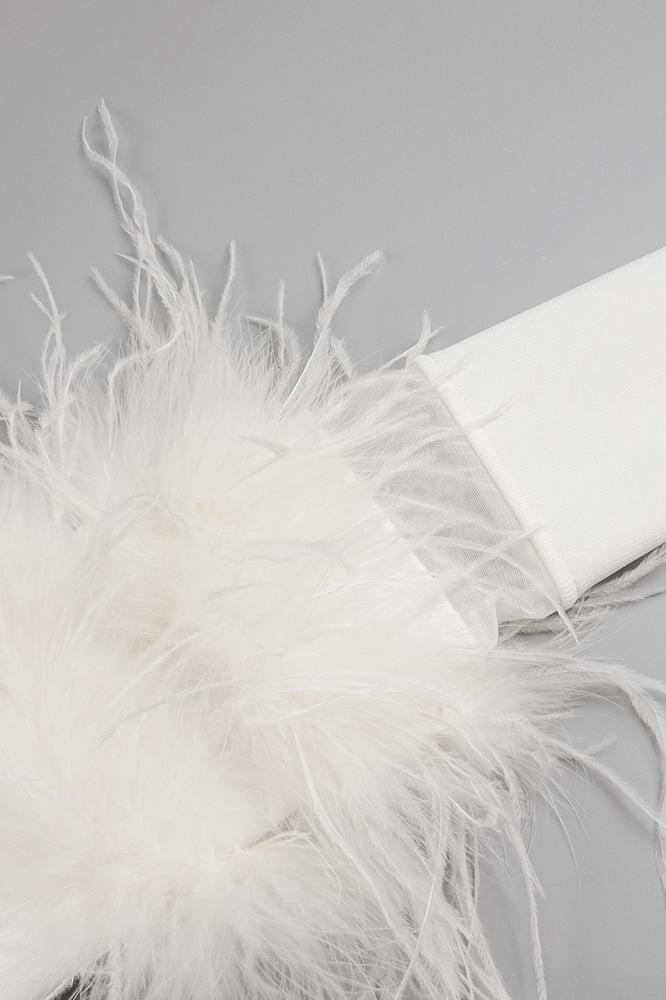 - Off Shoulder, Feather Decored, Panelled Color Block Design, Semi Sheer, See-through, Calf Length.