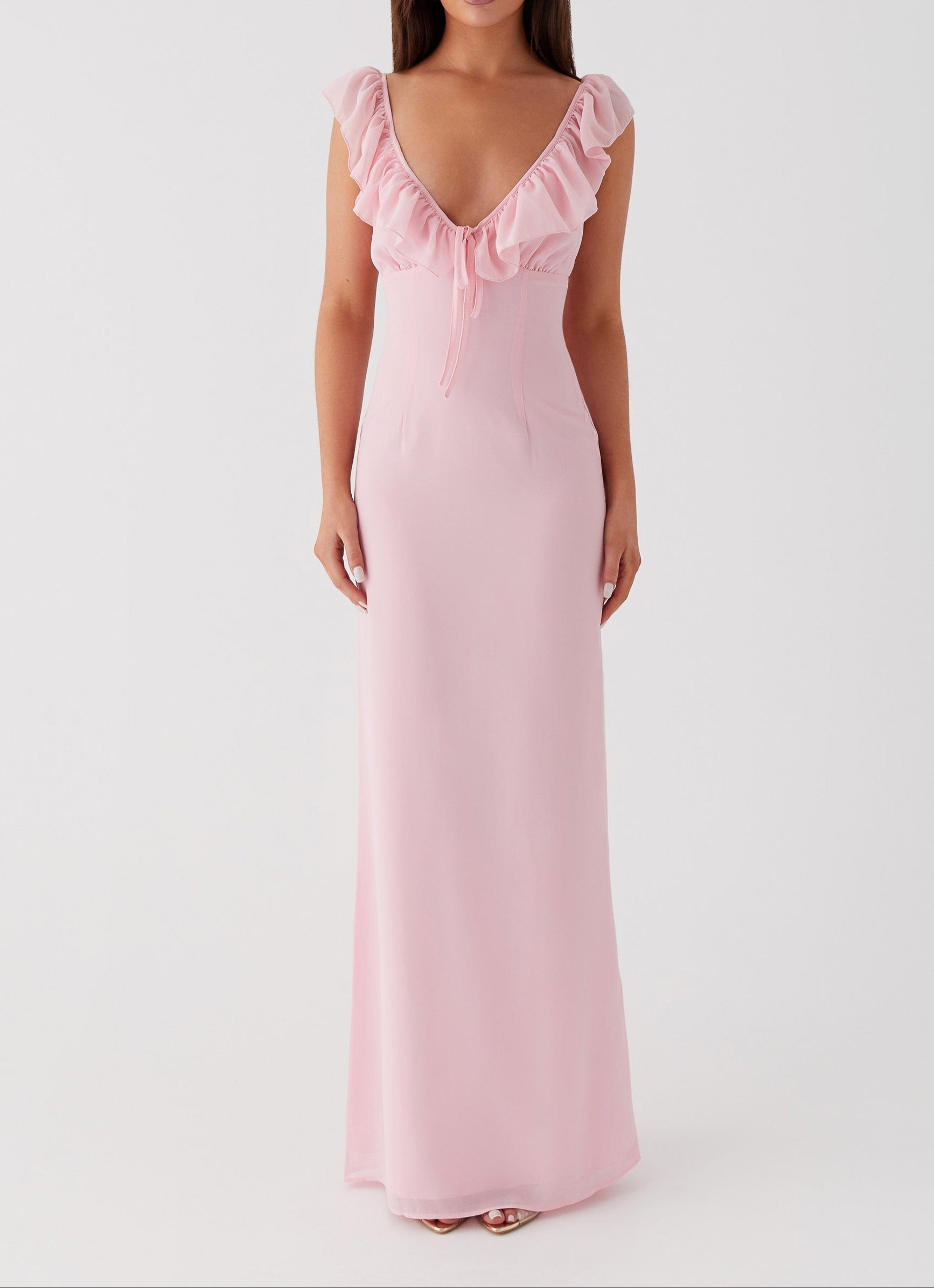 Designed for unforgettable evenings, this stunning maxi dress combines romantic details with effortless sophistication. The flattering V-neckline and delicate frill accents create a feminine silhouette perfect for special occasions.