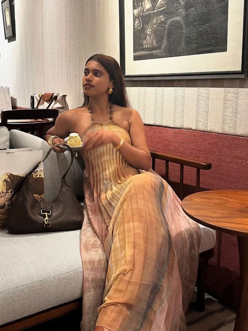 Tie Dye Beaded Halterneck Pleated Maxi Dress
