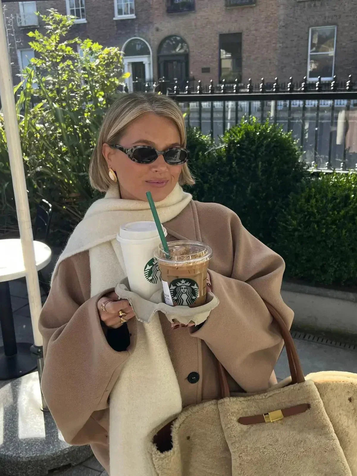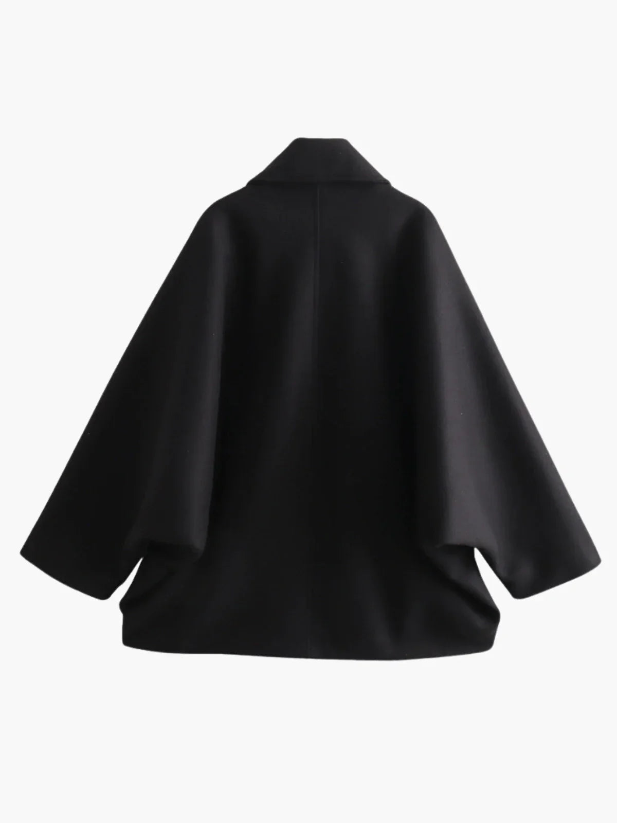 This sand-tone wool blend coat features a minimalist, slightly oversized design with a wide collar and button-down closure. With practical front pockets and a relaxed fit, it’s perfect for layering and adds an elegant touch to any outfit, making it a versatile choice for cold-weather styling.
