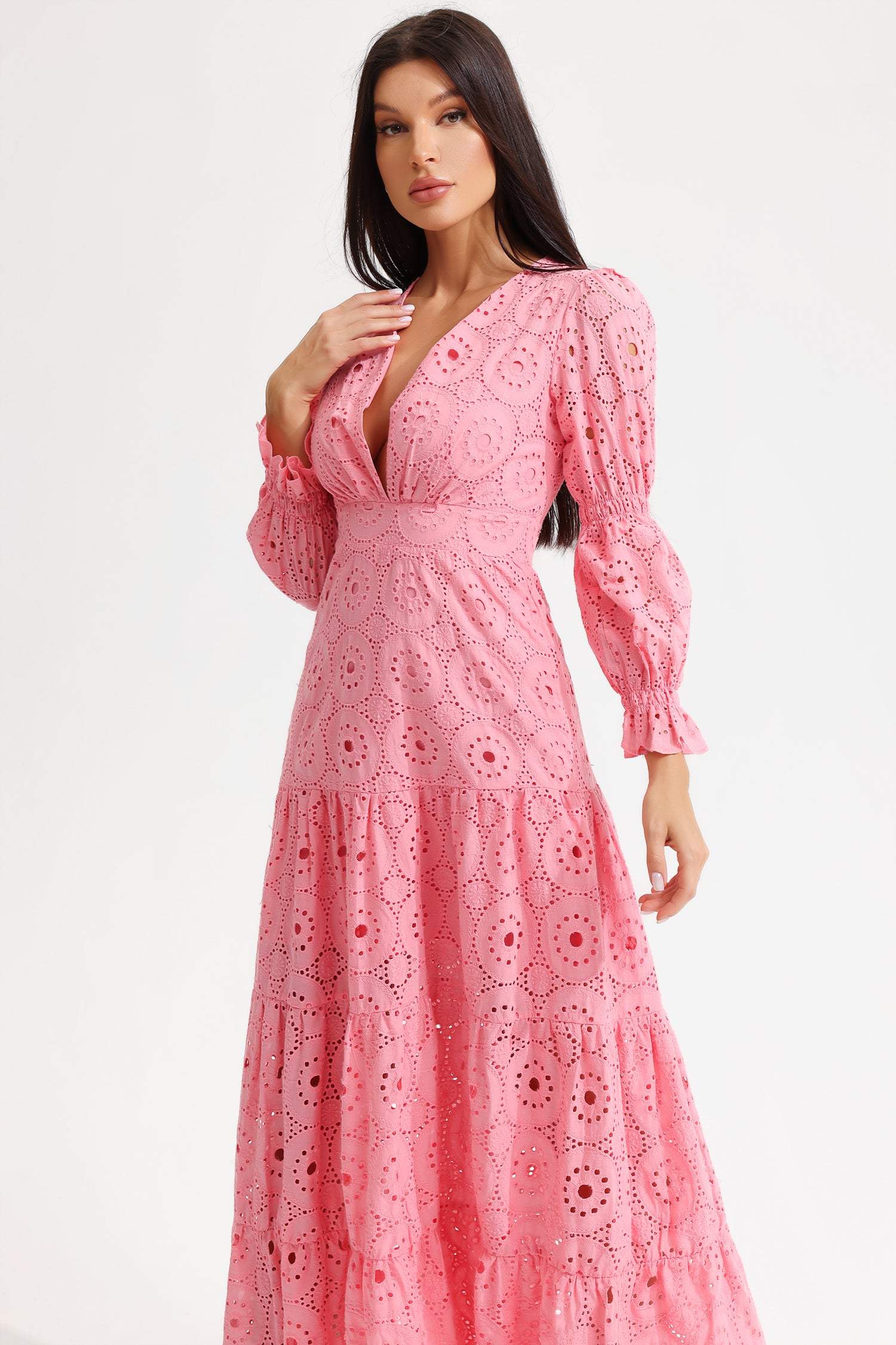 - V-neck, lantern sleeve, tapered waist, midi dress, pink