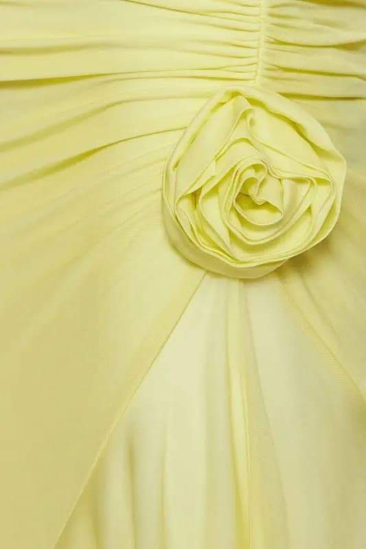 - Asymmetric Ruffle Hem, Ruched Front Panel, Flower Appliqu��, Midi Length.