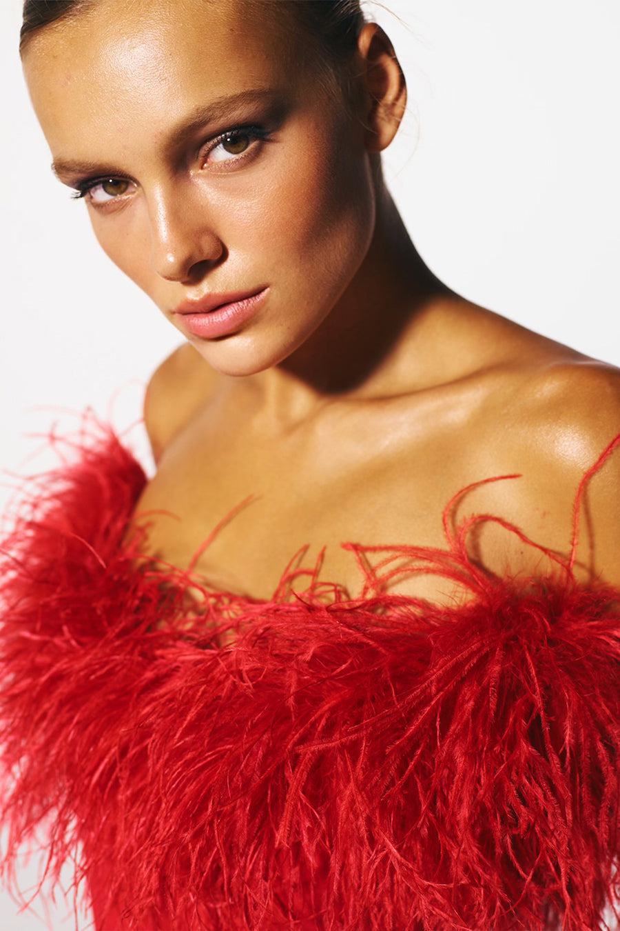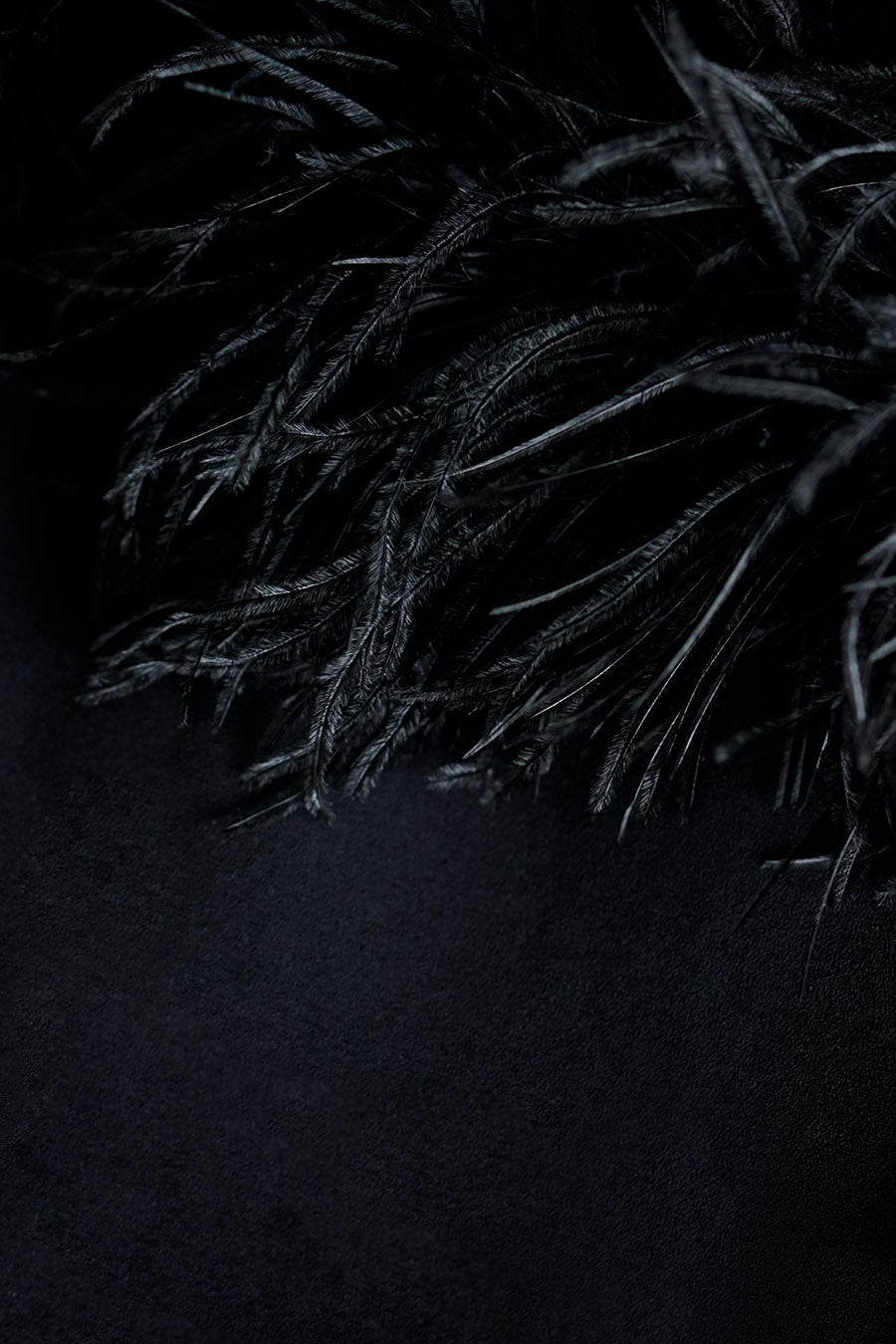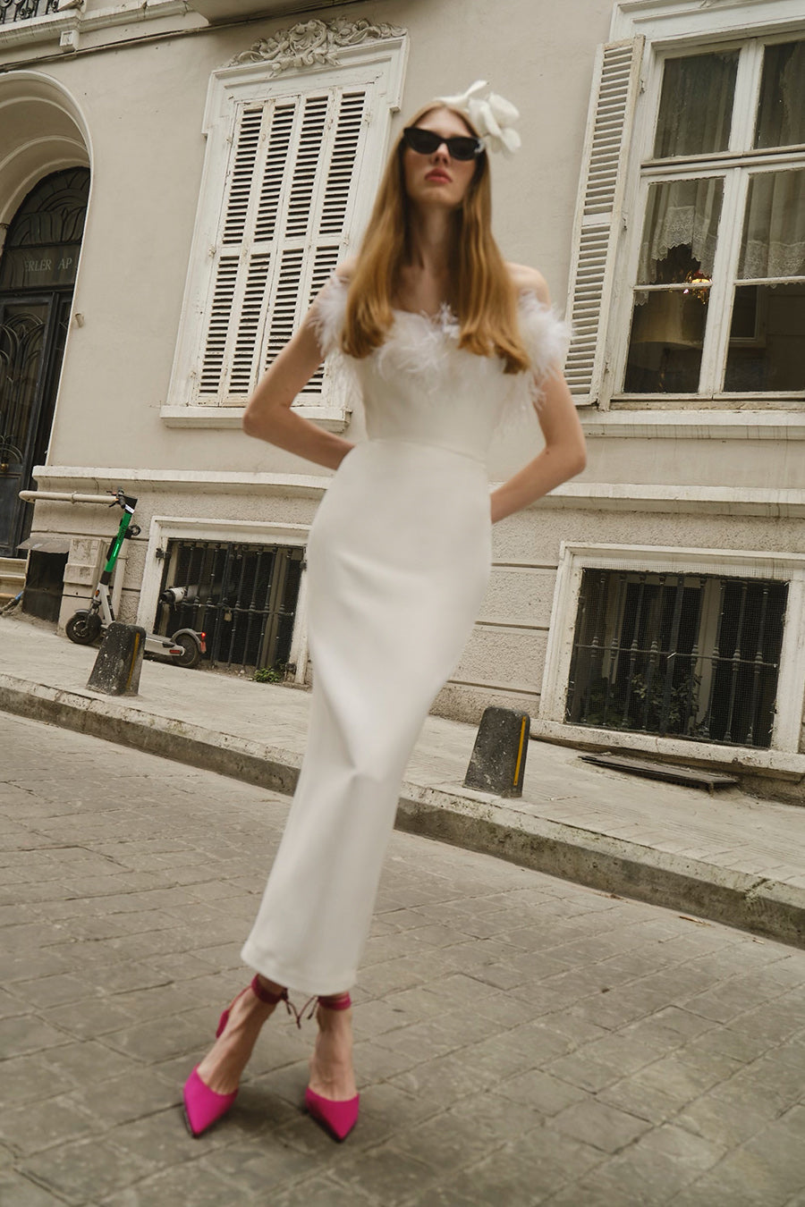 Strapless, Sharp Sweetheart, Feather-trimmed, Maxi Length.
