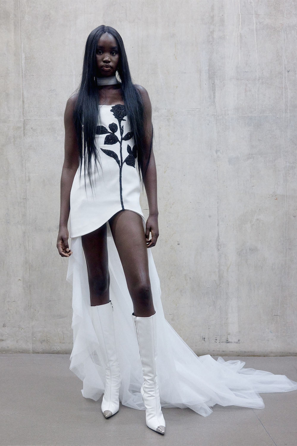Asymmetrical, Strapless Design, Crystal Flower Pattern Embellishment, Tulle-draped Train, Contrasting Trim, Mini Length.