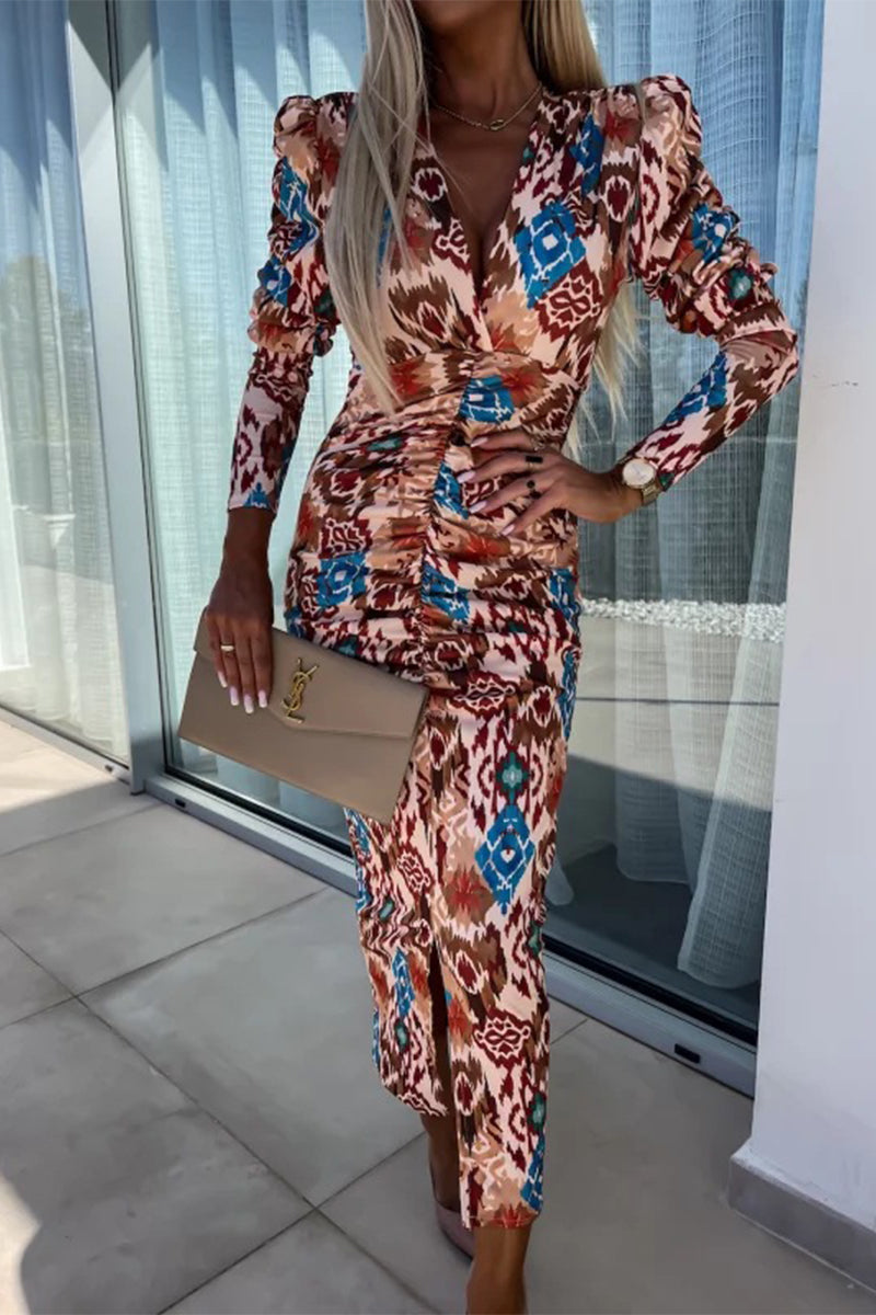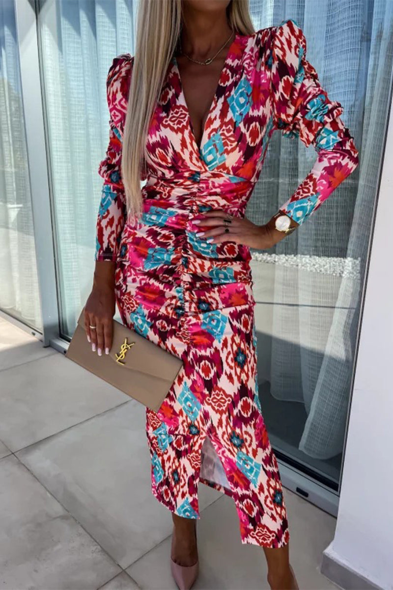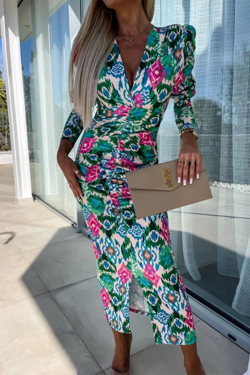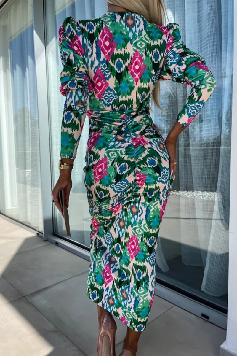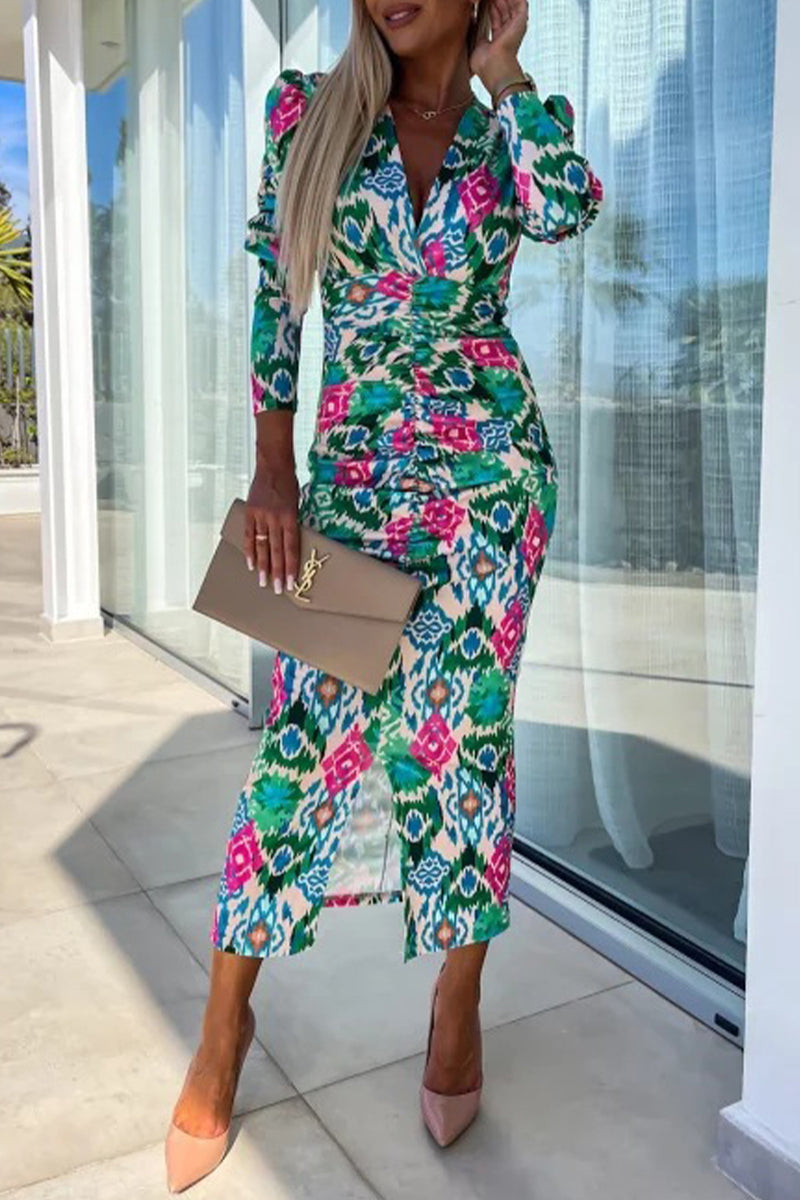 Vintage Elegant Floral Fold V Neck One Step Skirt Dresses