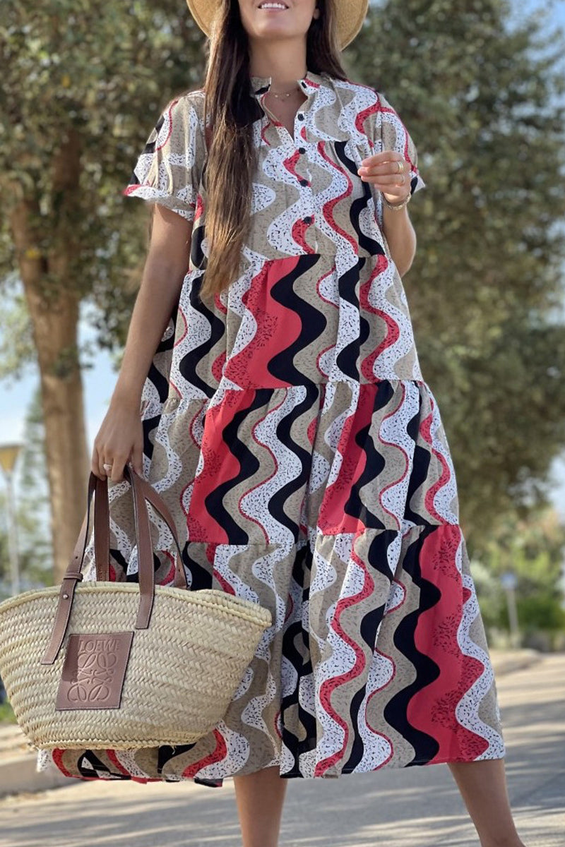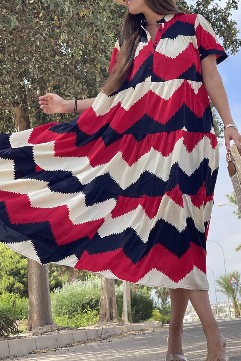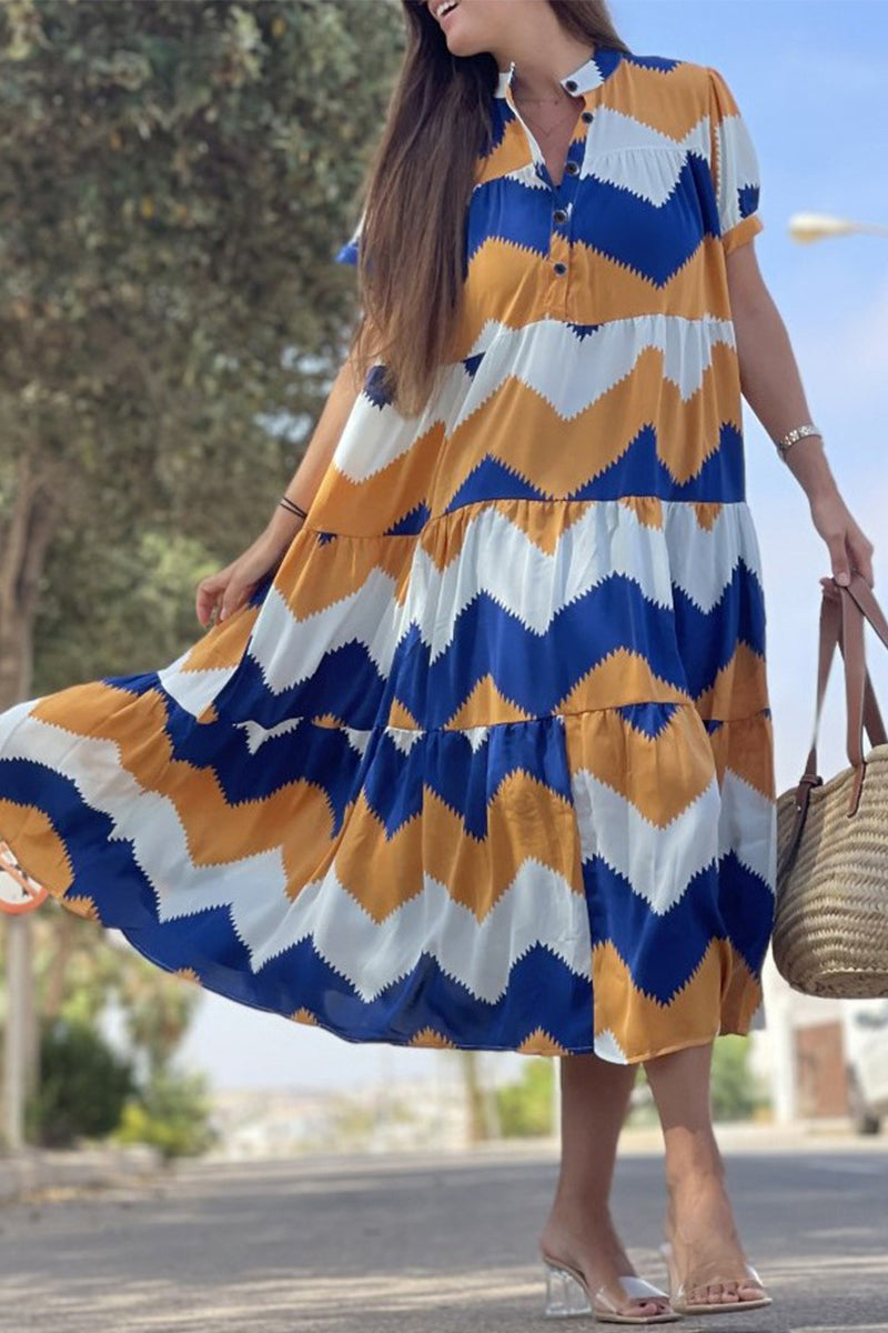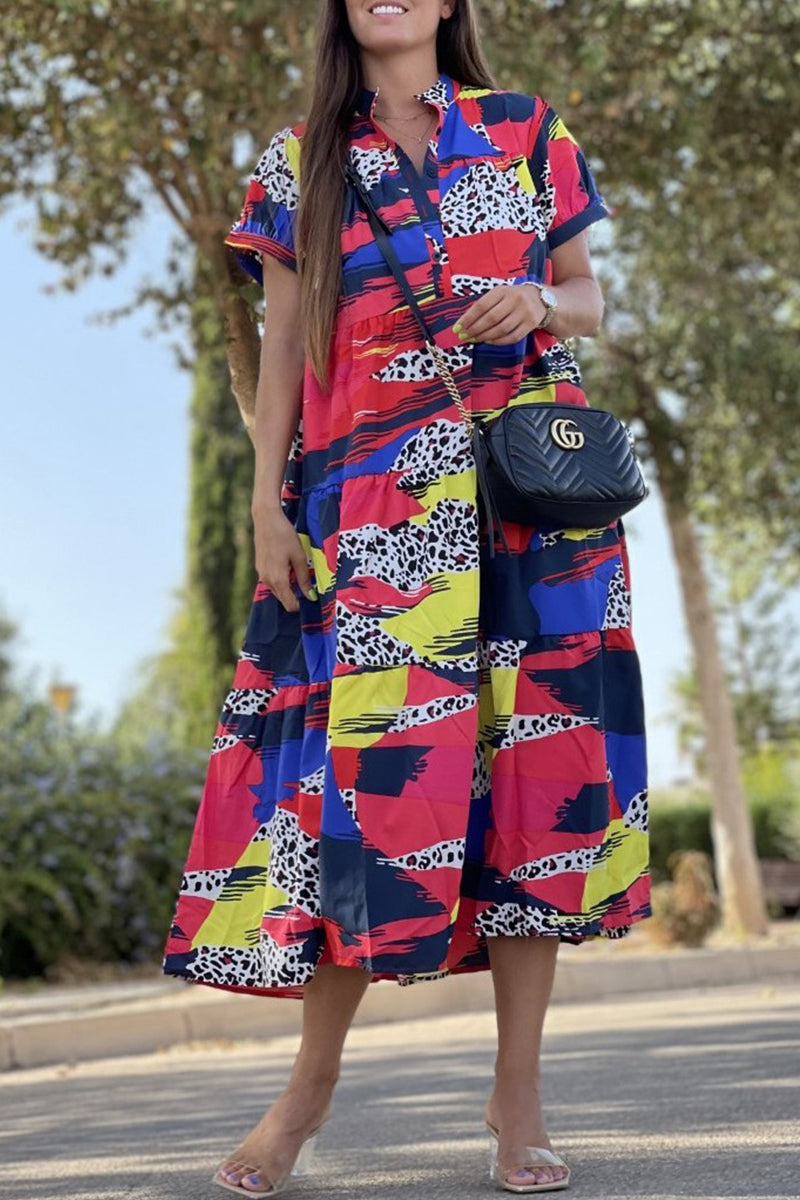Vintage Elegant Geometric Print Patchwork O Neck A Line Dresses(5 Colors)