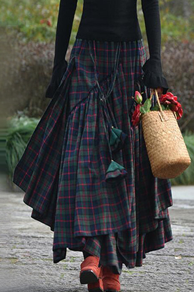 Vintage Plaid Patchwork Flounce Asymmetrical Full Print Bottoms