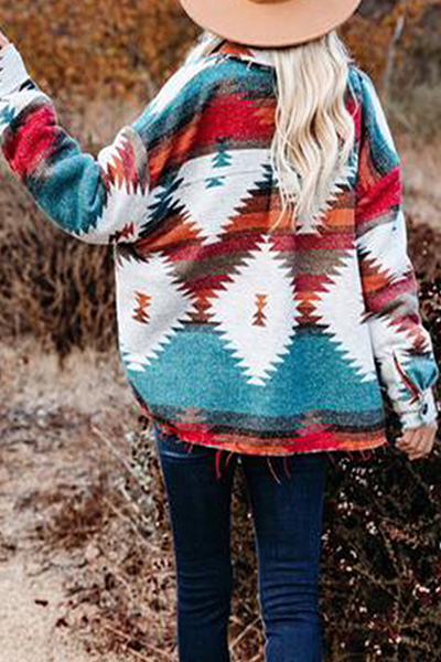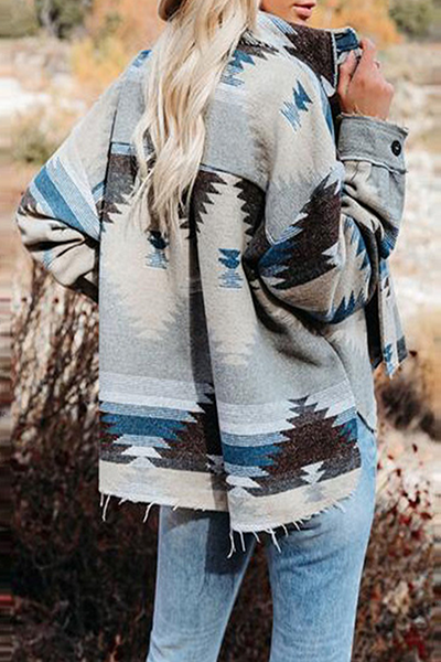 Vintage Print Pocket Buckle Turndown Collar Outerwear