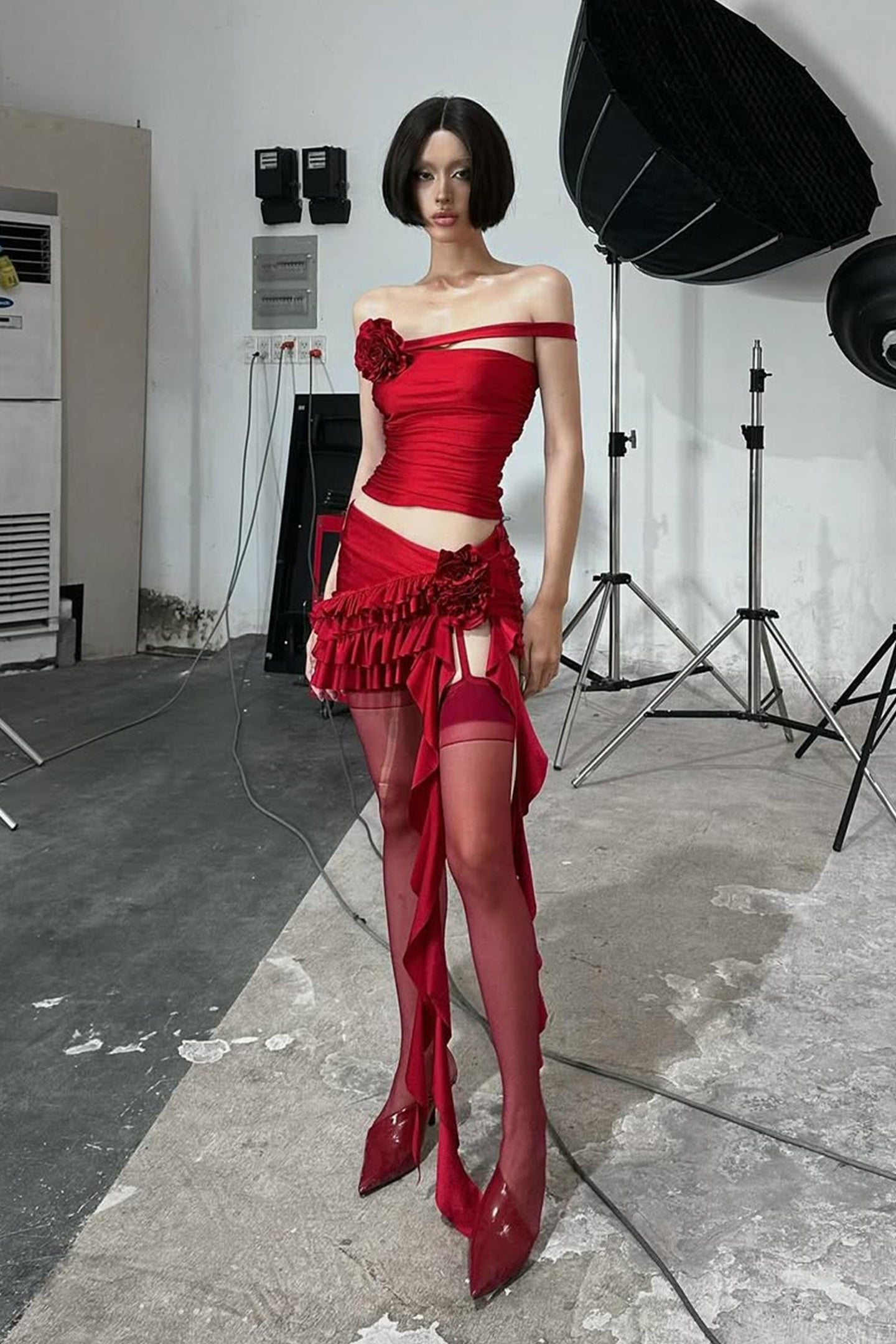 Floral Applique, Asymmetrical Hem, Pleated Ruffle Detail.
