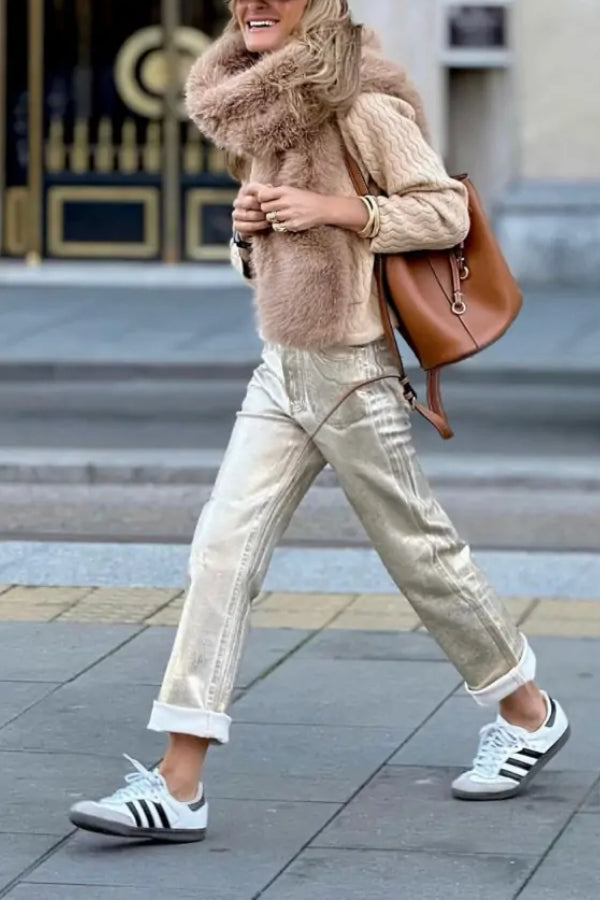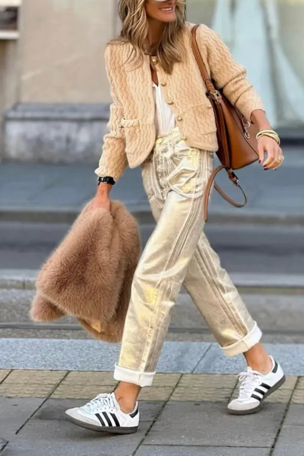 • Adorned with a vertical zig-zag stitch and gold buttons with a shield.