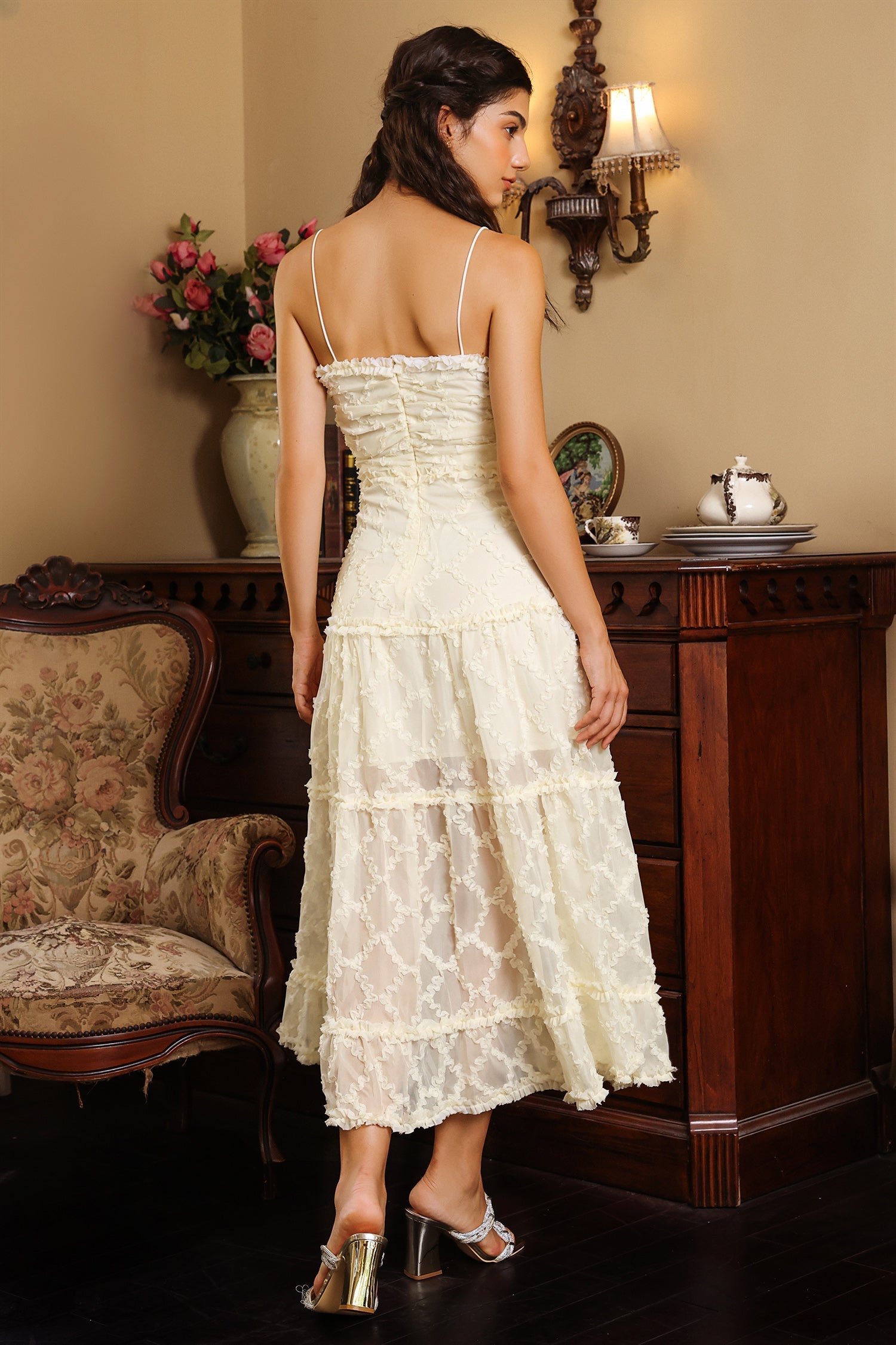 - Square collar, pleated, cami dress, ruffle hem, sleeveless