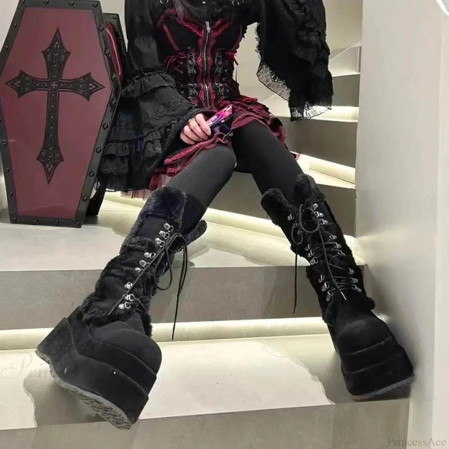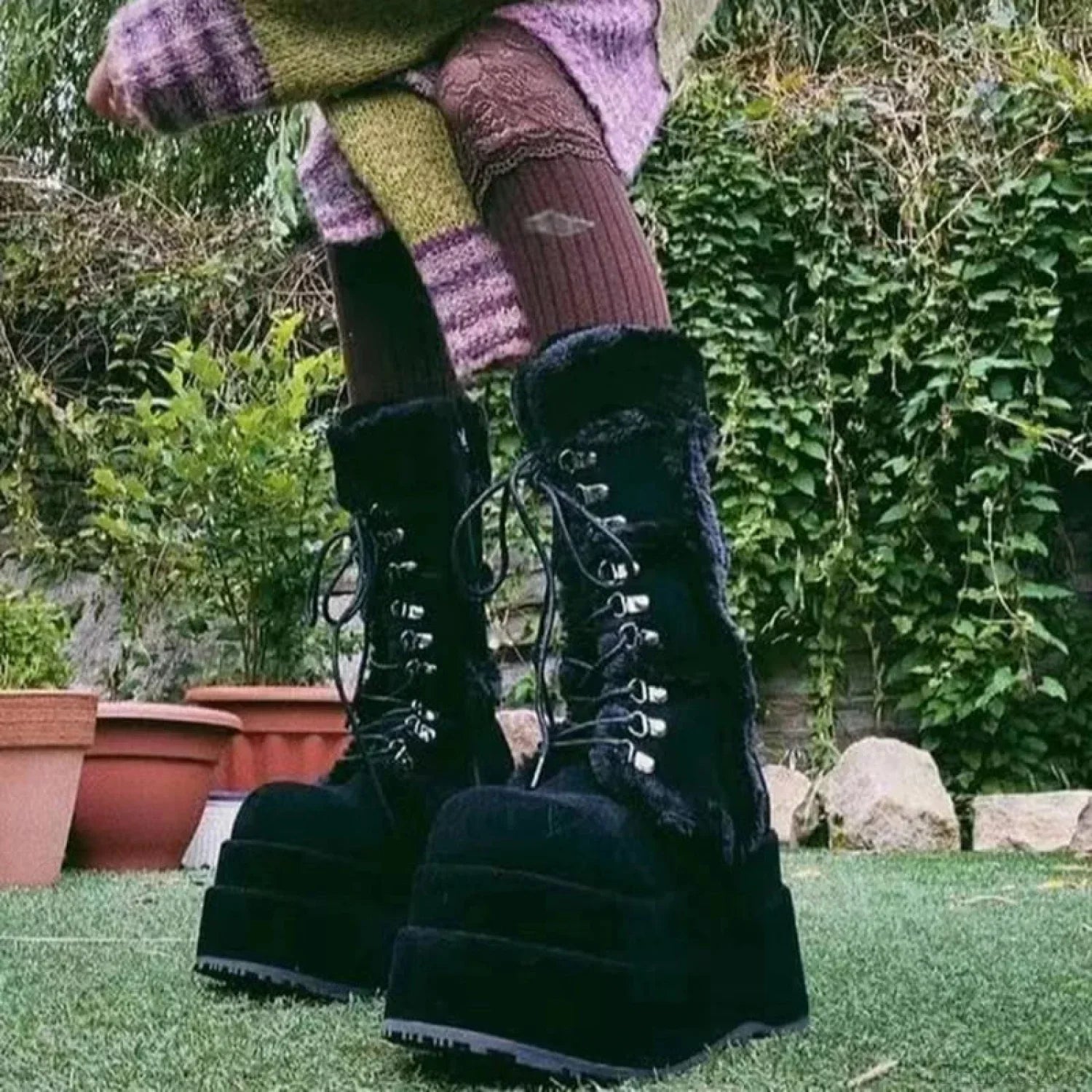 White Hairy Tall Platform Chunky Heel Gothic Winter Boot