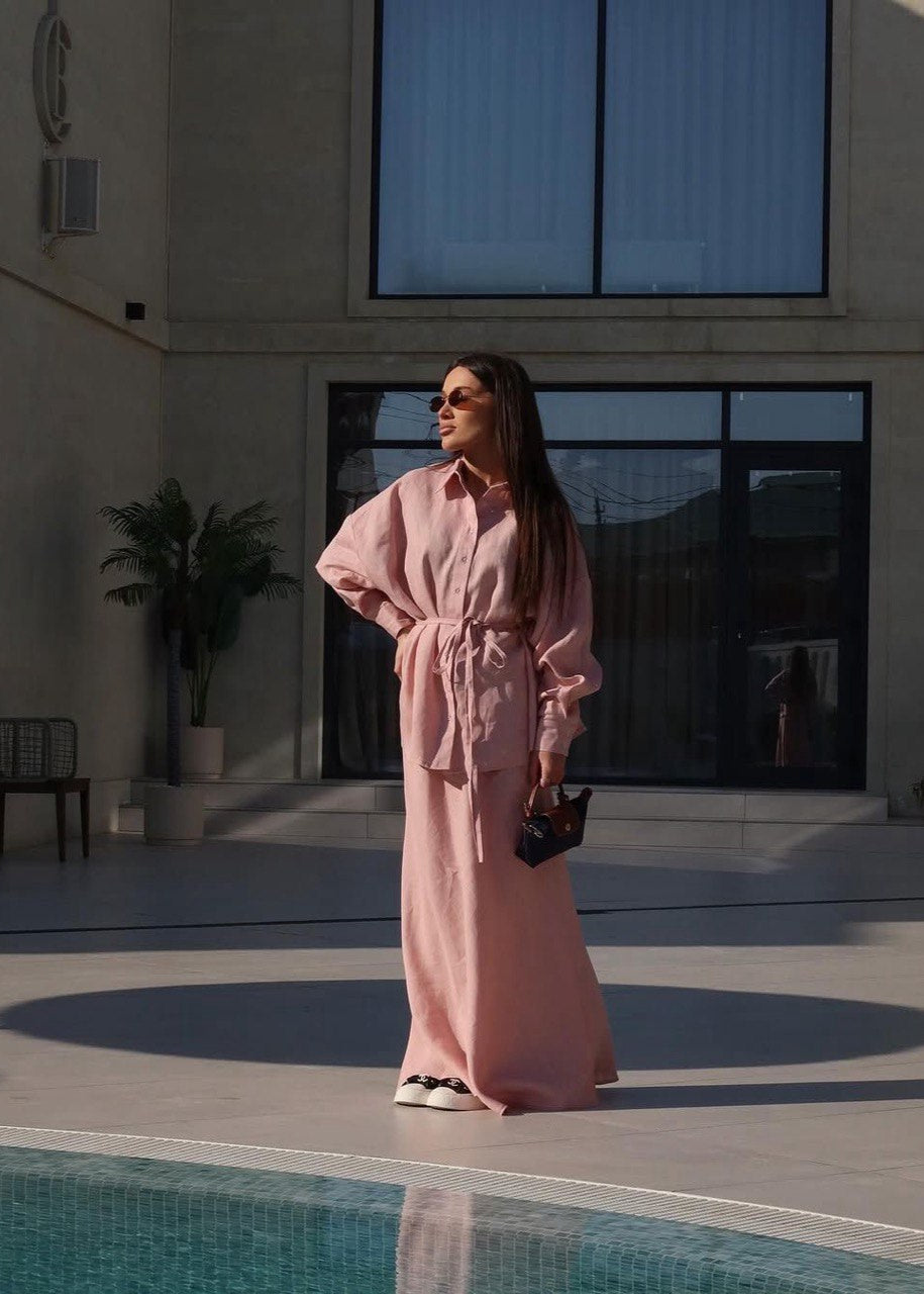 The Willow Set features a relaxed-fit button-down shirt with lantern sleeves, a tie-waist belt, and a matching flowy maxi skirt. Crafted from breathable fabric with a soft hand feel, this two-piece ensemble blends everyday comfort with a tailored silhouette. The top is designed with a longline hem and classic collar, while the full-length skirt delivers fluid movement and an elegant drape.